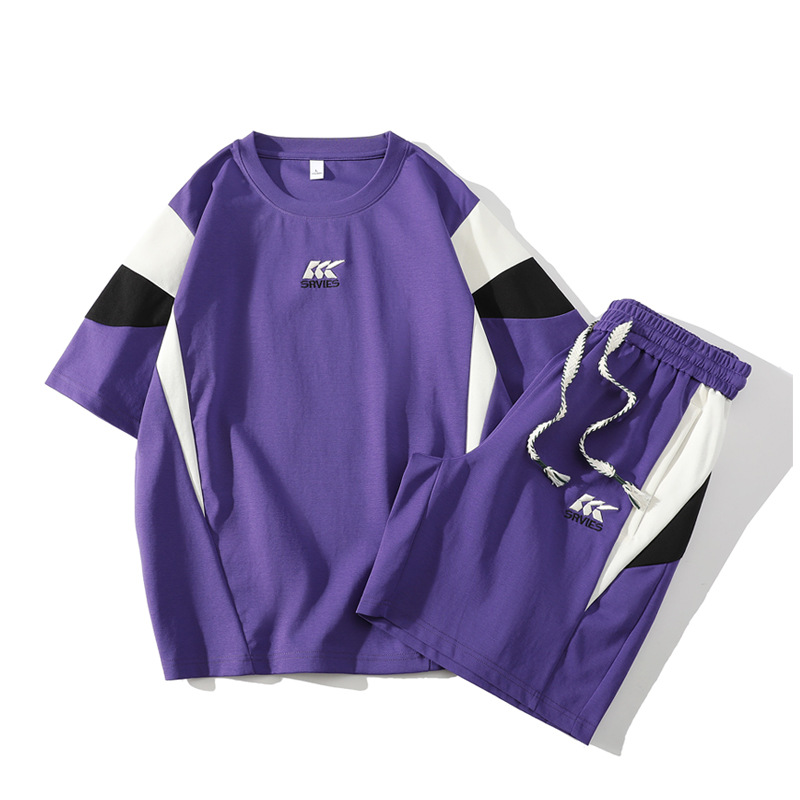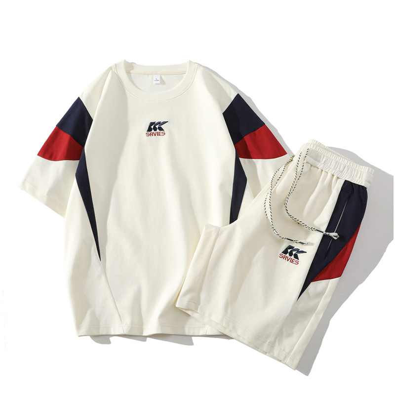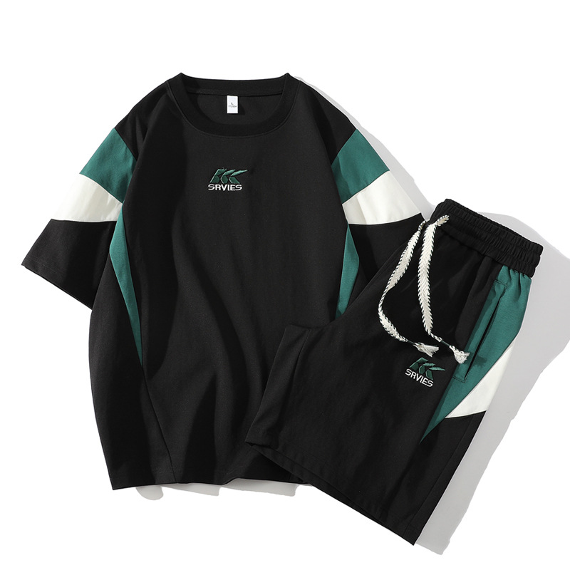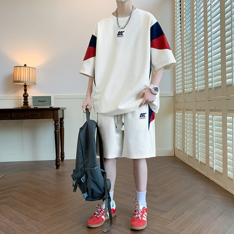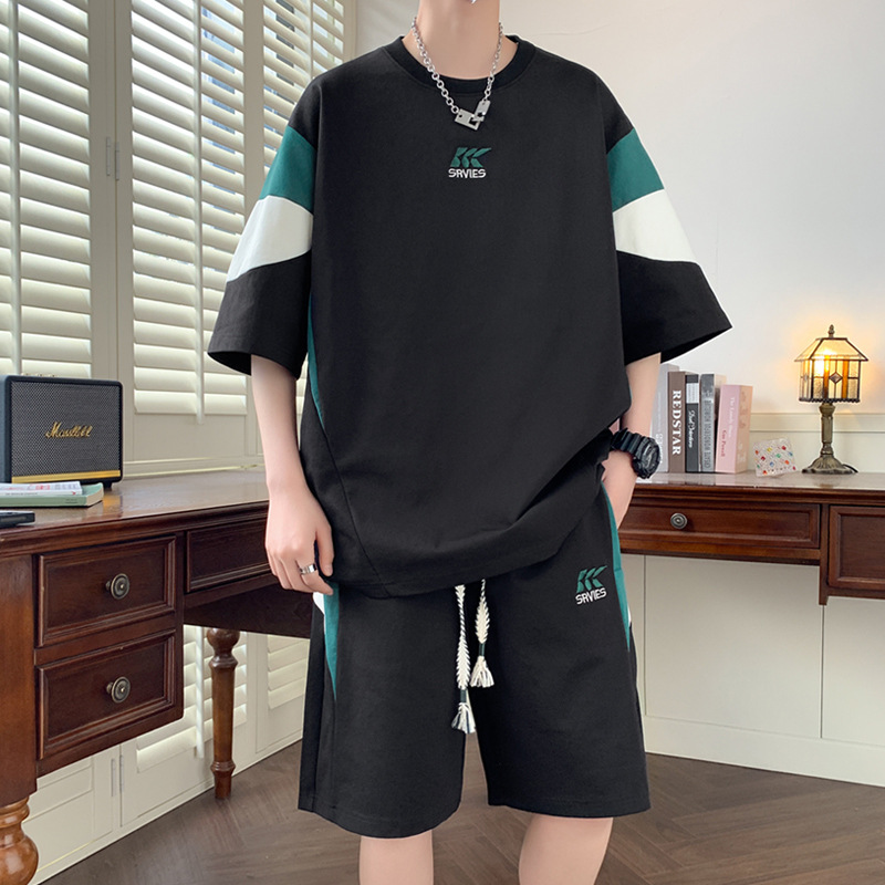 休闲运动套装男士夏季新款一整套短袖t恤短裤宽松圆领拼接两件套