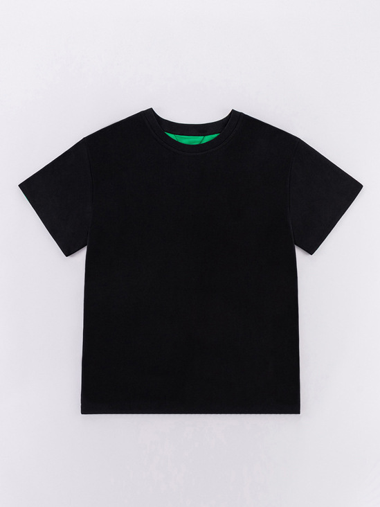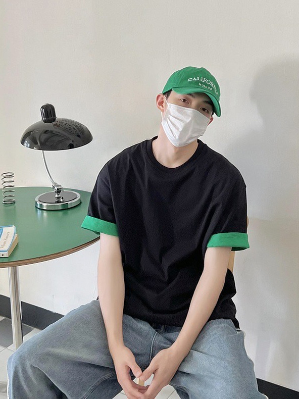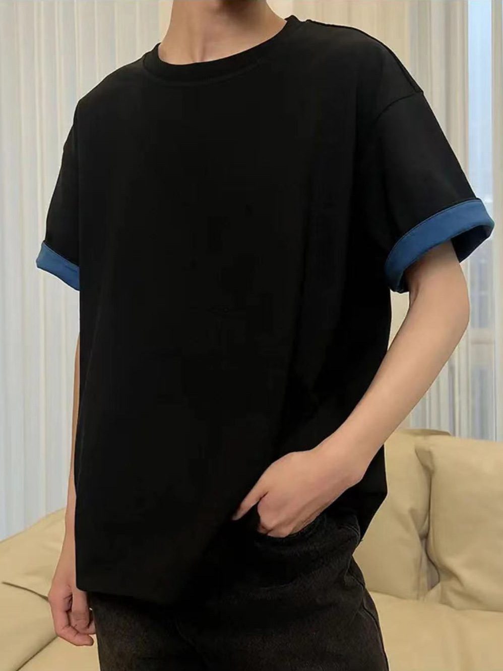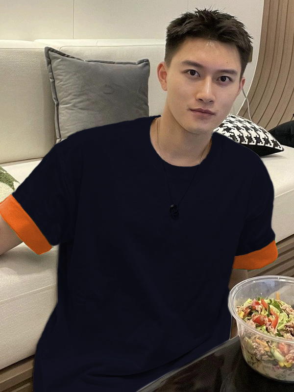 B/V风格拼接两色双层重磅纯棉休闲宽松男女情侣款短袖T恤