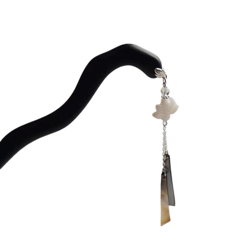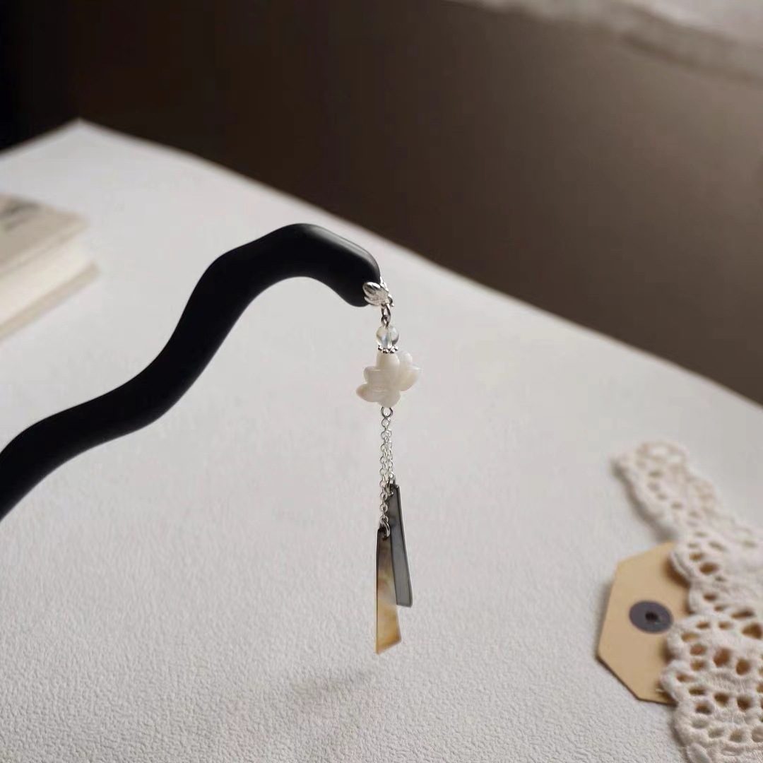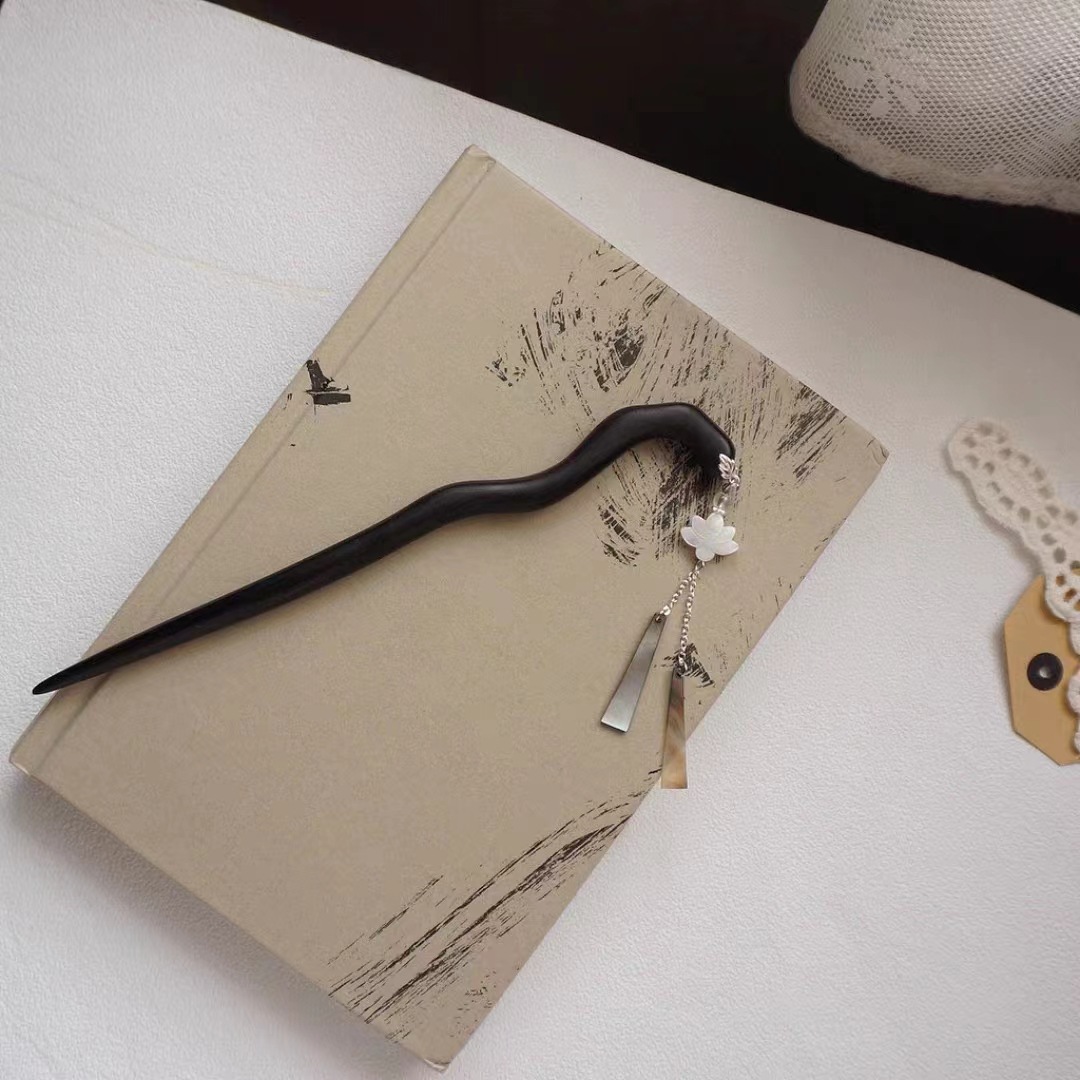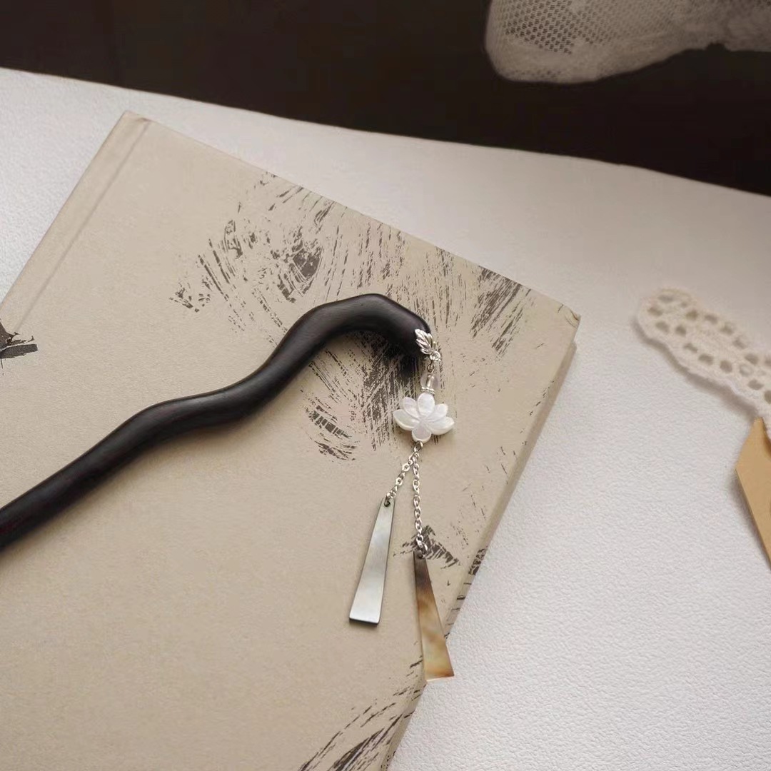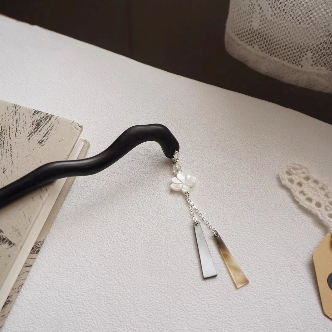 原创新中式国风旗袍汉服盘发簪子发钗古典黑檀木黑贝壳莲花发饰女