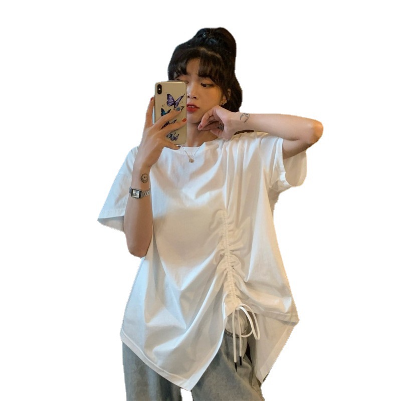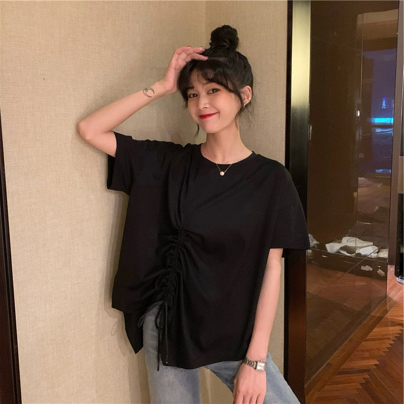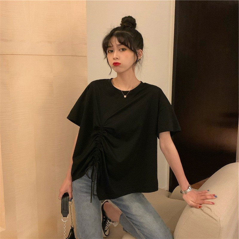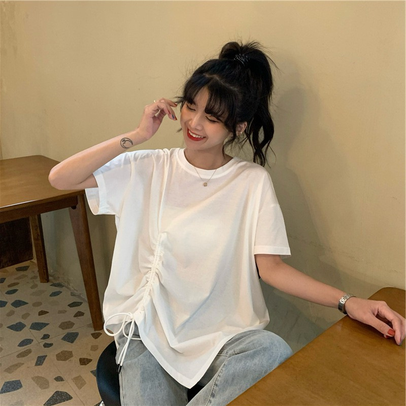 棉质薄款夏季短袖t恤女韩版纯色宽松抽绳不规则圆领上衣