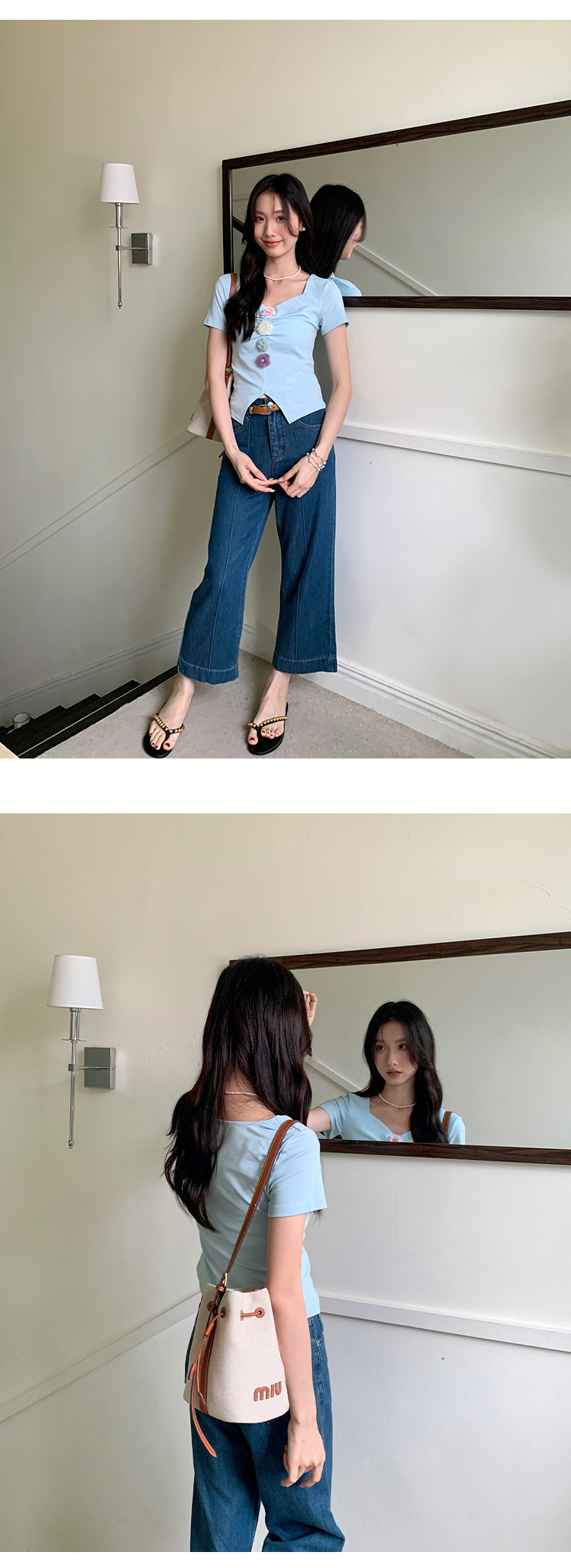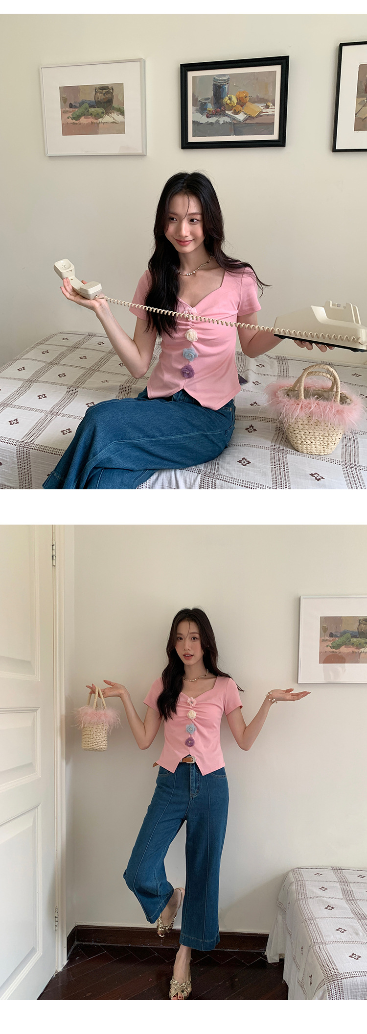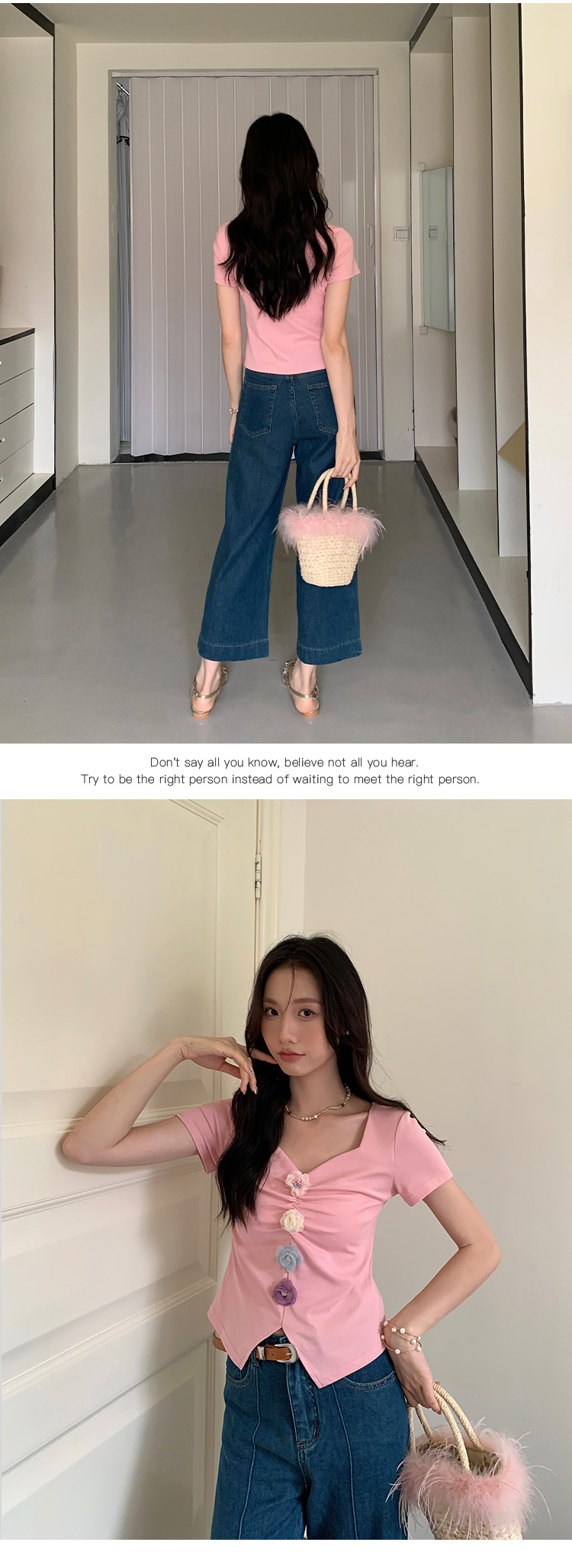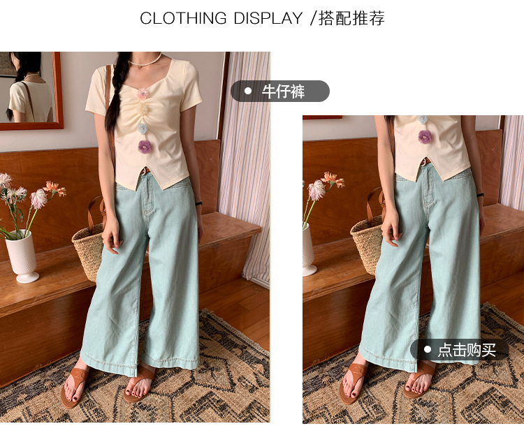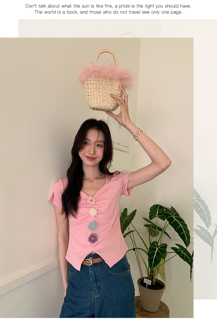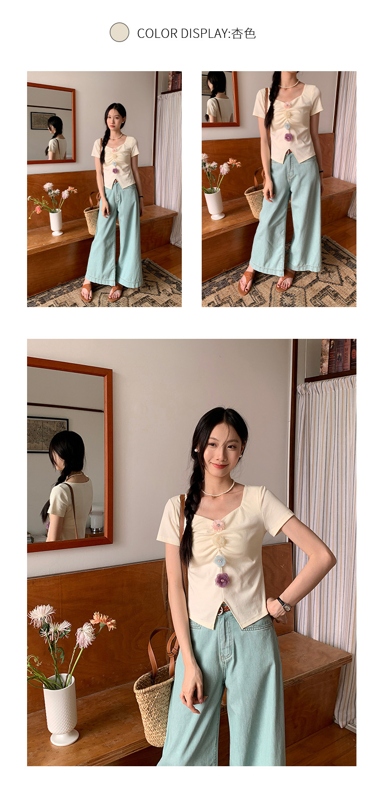 夏季韩系甜美立体手工花朵褶皱方领短袖T恤