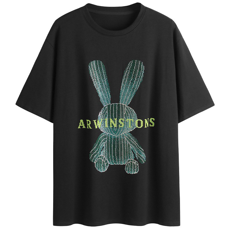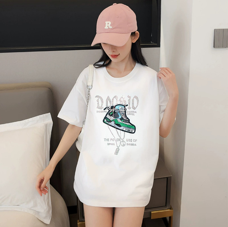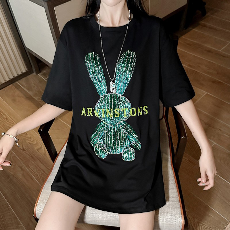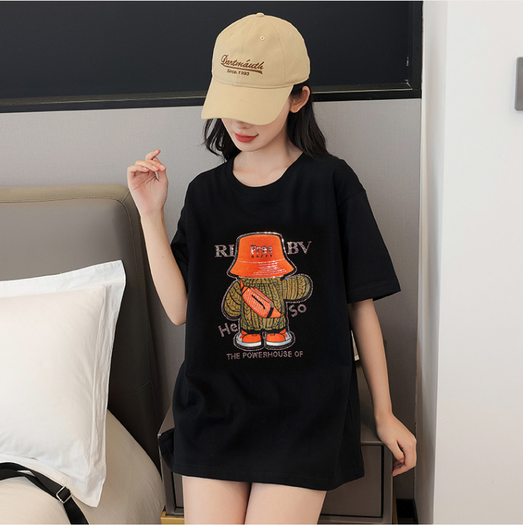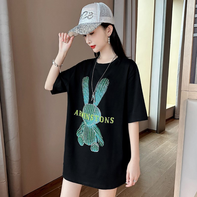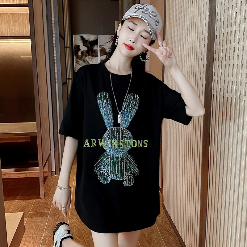 新款潮牌重工烫钻大码宽松短袖T恤女圆领休闲半袖打底上衣