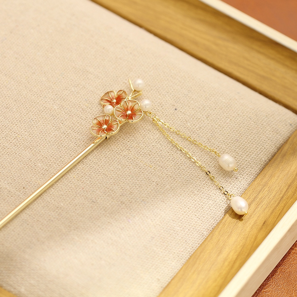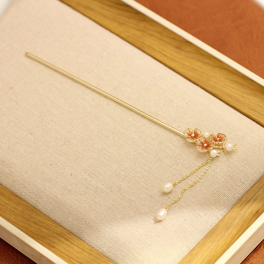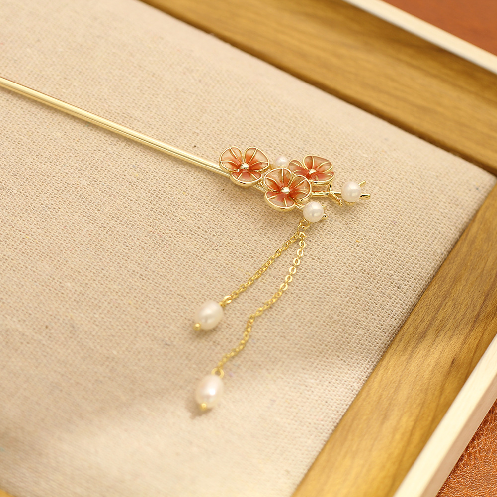 国风滴油杏花花枝镀金发簪气质简约汉服旗袍盘发流苏发饰簪子女款