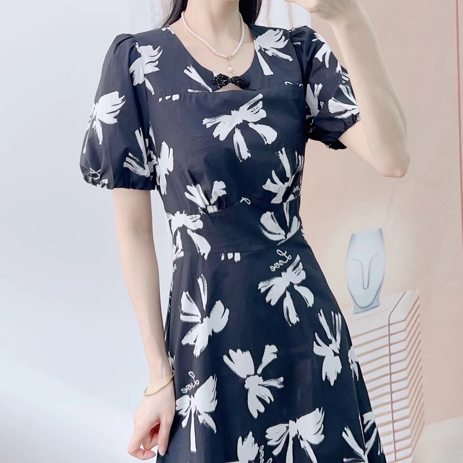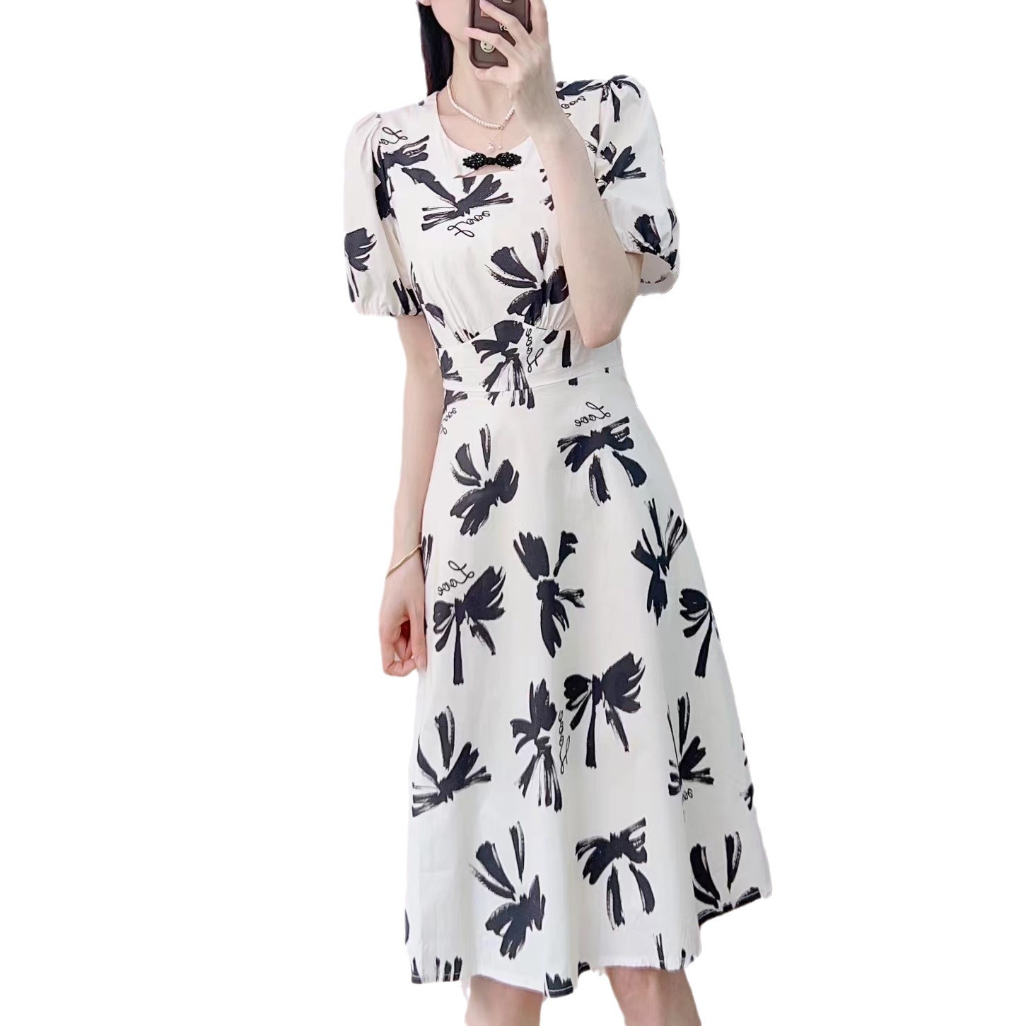 夏季品牌专柜新品甜美镂空印花收腰短袖连衣裙