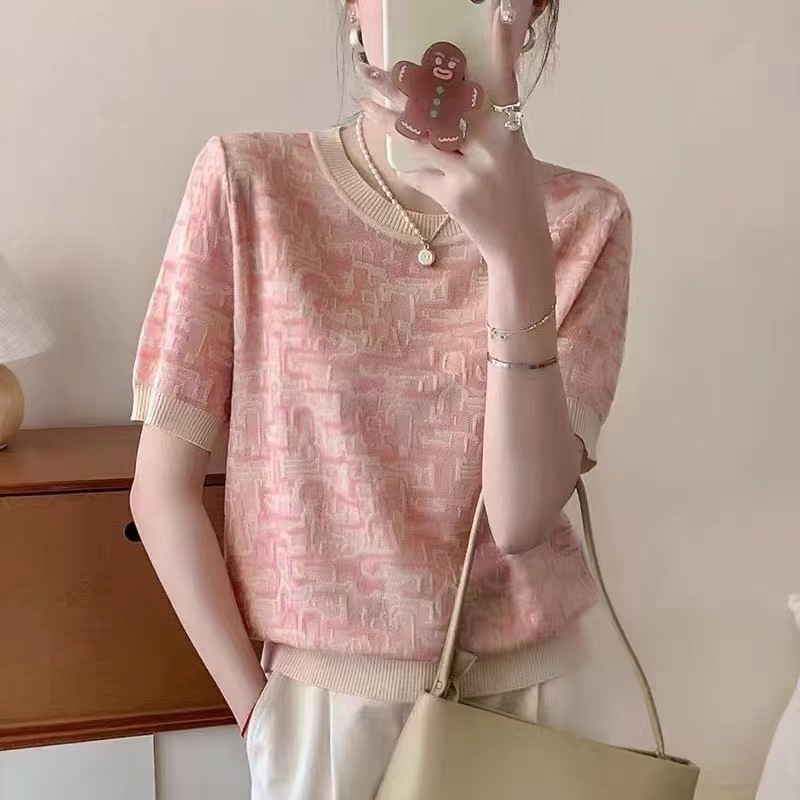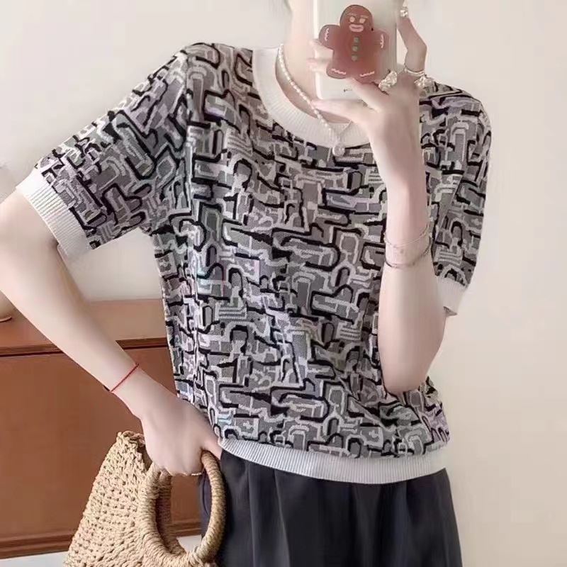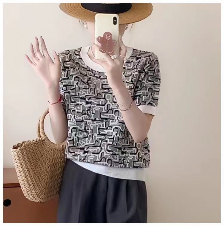 新款满体花色短袖圆领T恤衫女欧货夏季宽松套头冰丝针织衫
