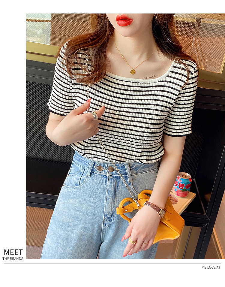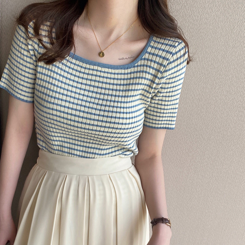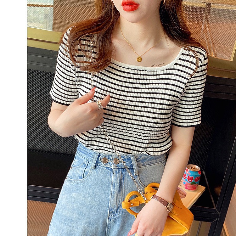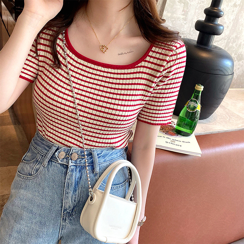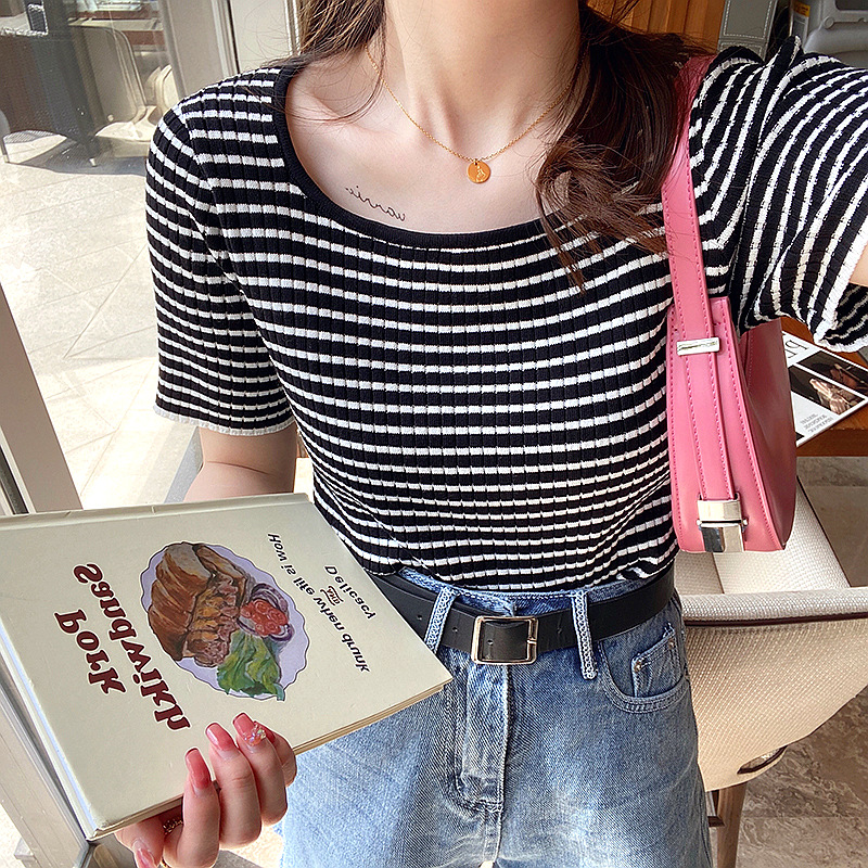 大领口t恤女夏方领设计感小众条纹短袖低领修身显瘦针织上衣