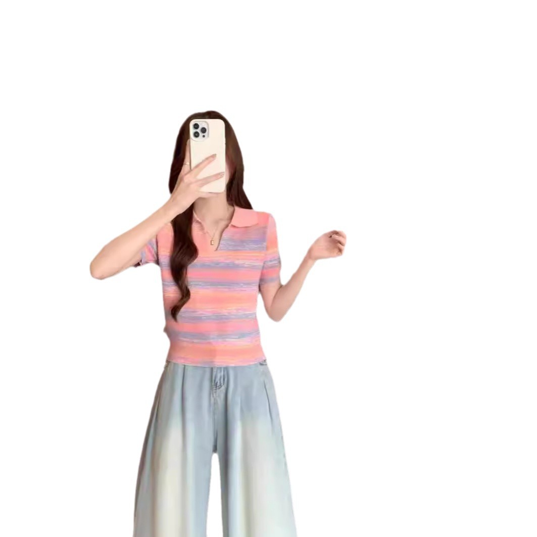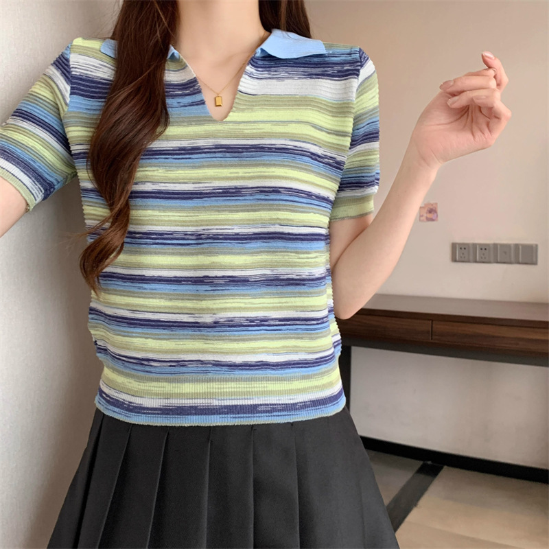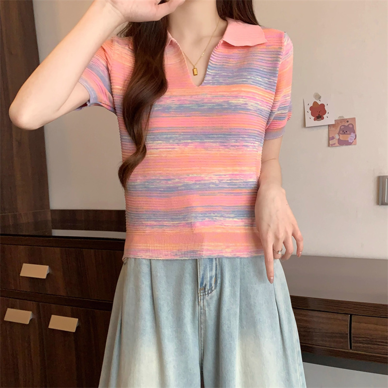 夏季彩虹色翻领短袖女夏季甜美套头薄款上衣软糯针织衫t恤女