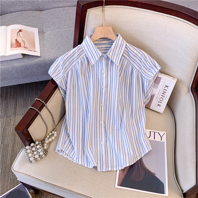 温柔风甜美蓝色条纹衬衫女夏装POLO领小飞袖上衣薄款宽松百搭小衫