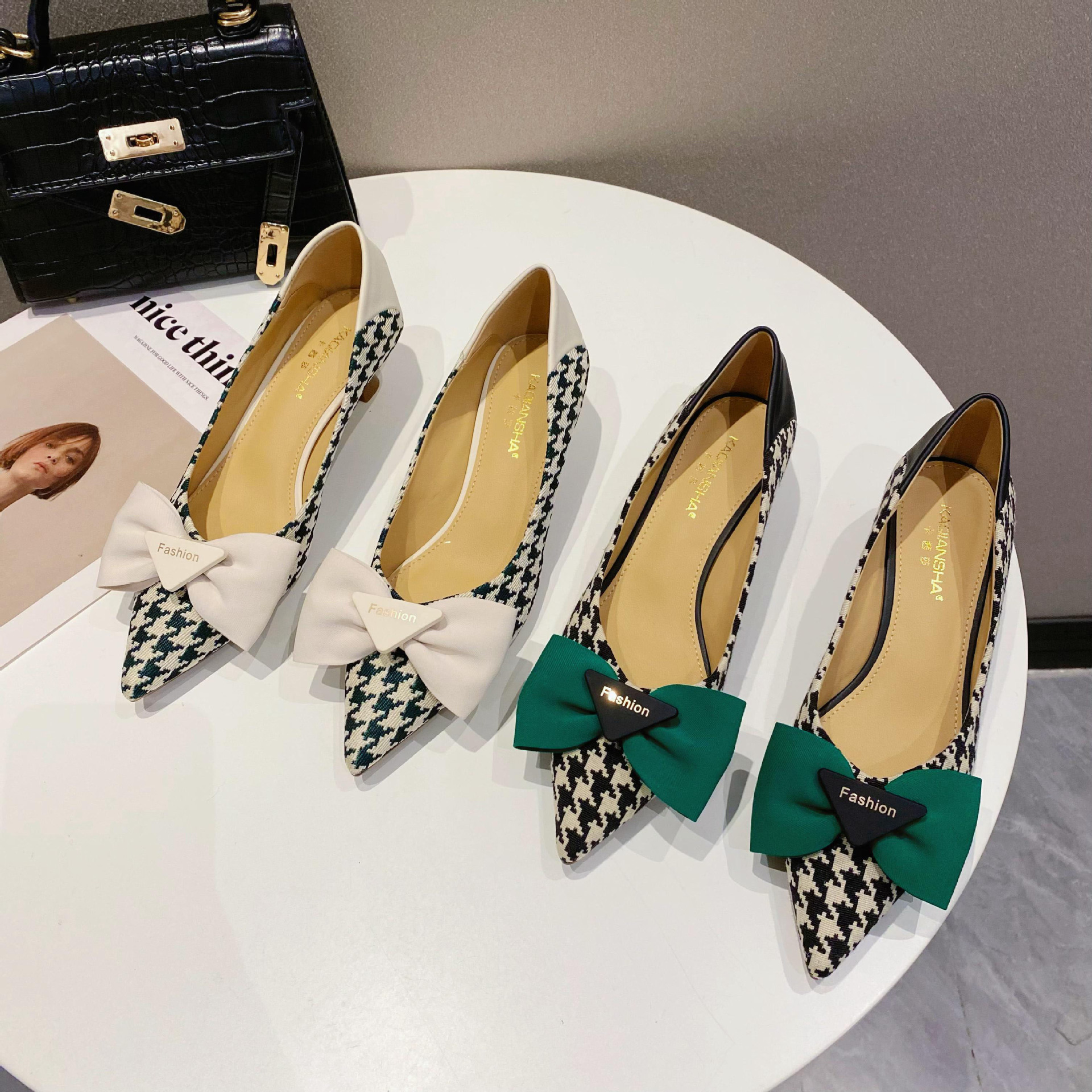 羊皮法式高跟鞋女尖头细跟气质千鸟格子拼色浅口新款单鞋