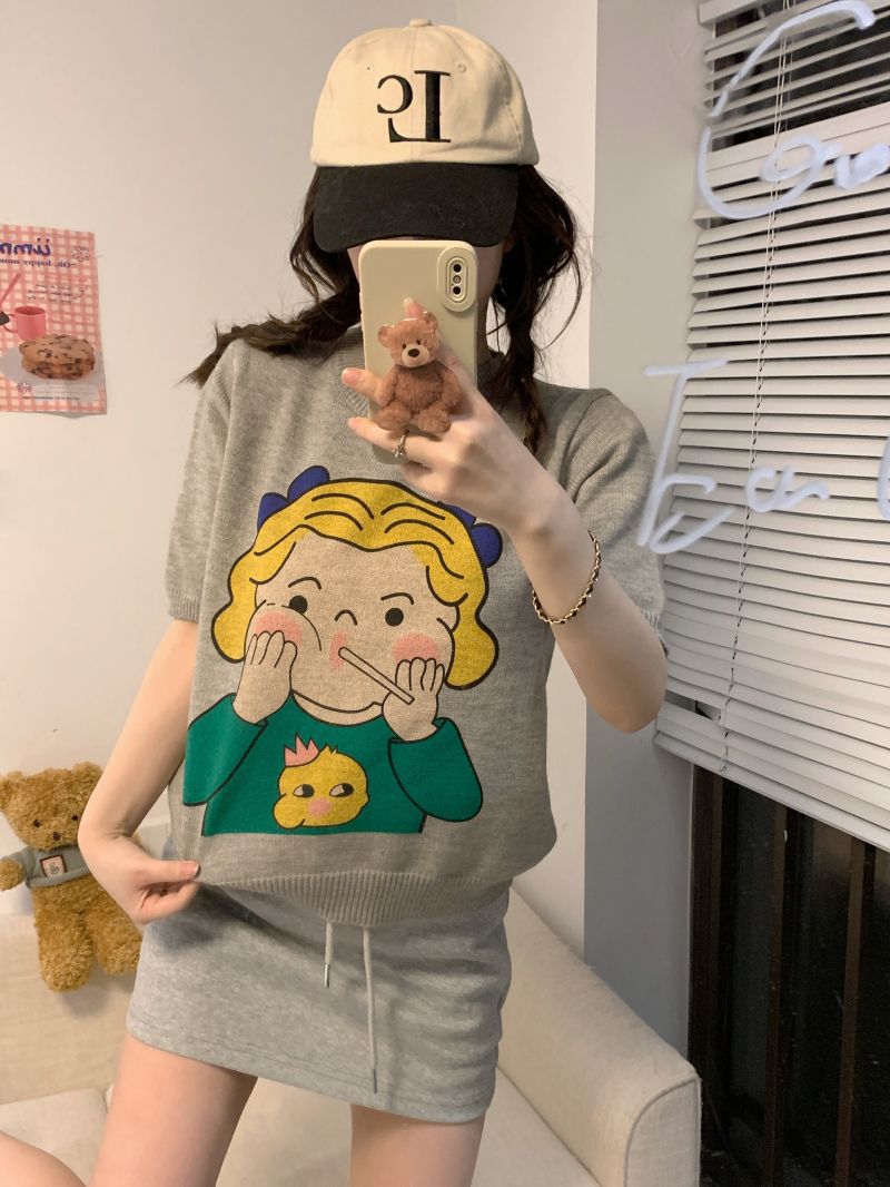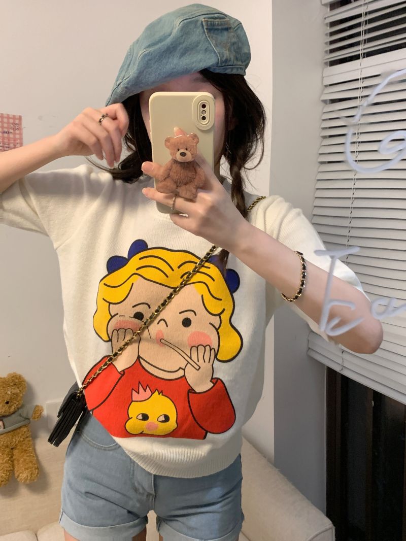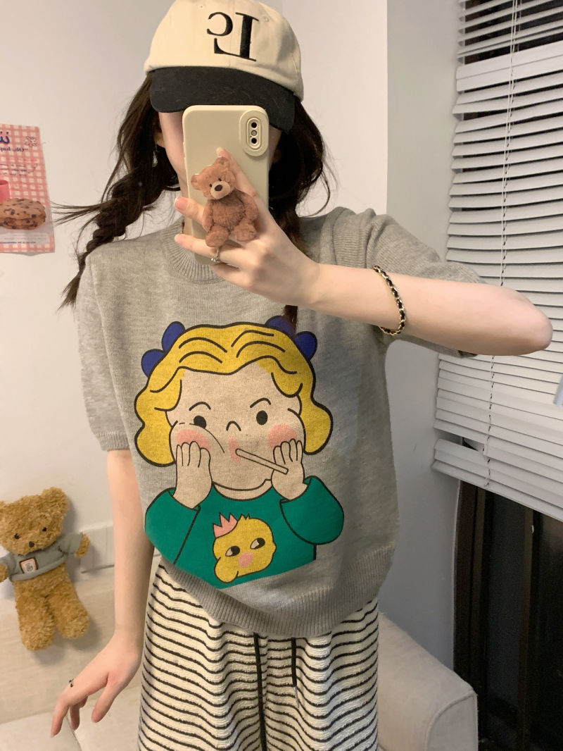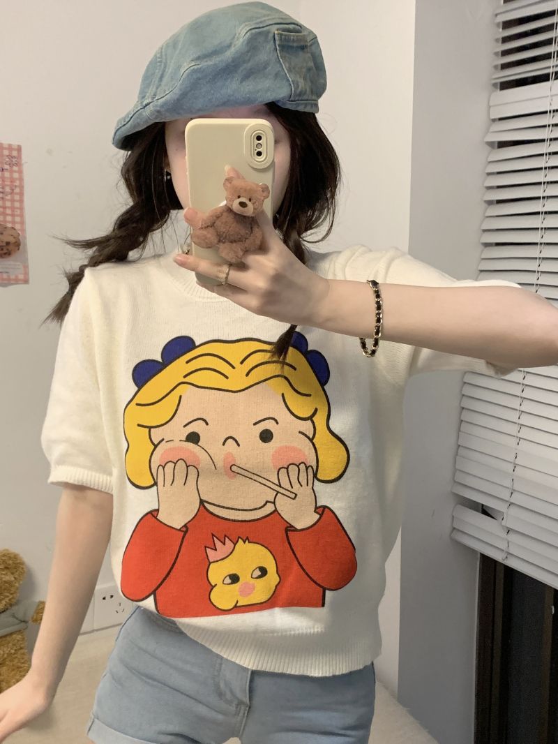 卡通印花针织短袖t恤女夏季新款宽松显瘦韩版半高领打底上衣