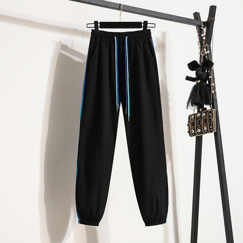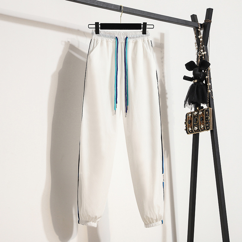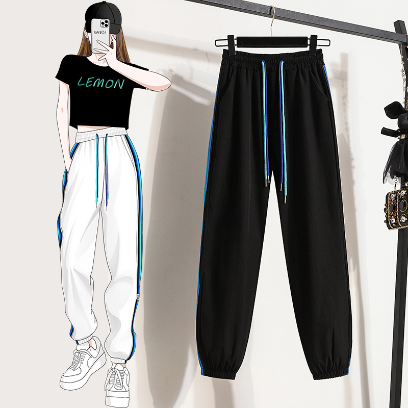 束脚裤子女夏季薄款高腰大码冰丝运动裤宽松撞色侧条纹卫裤潮