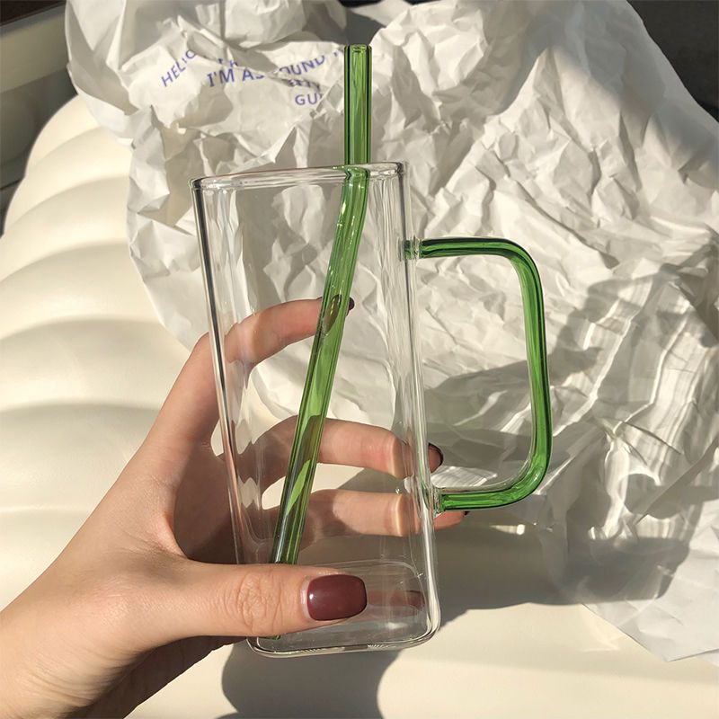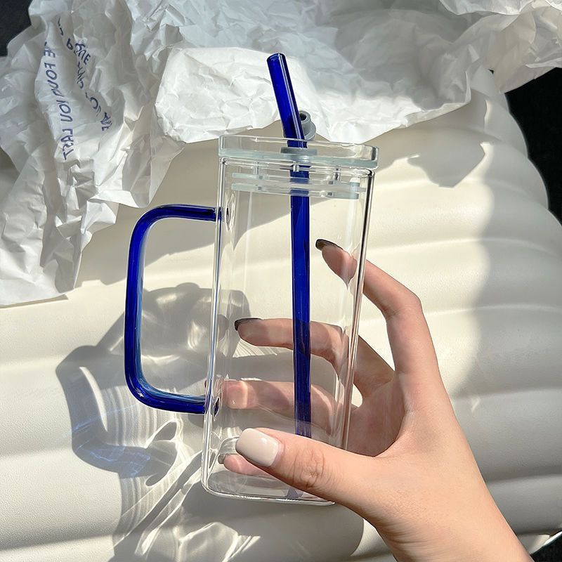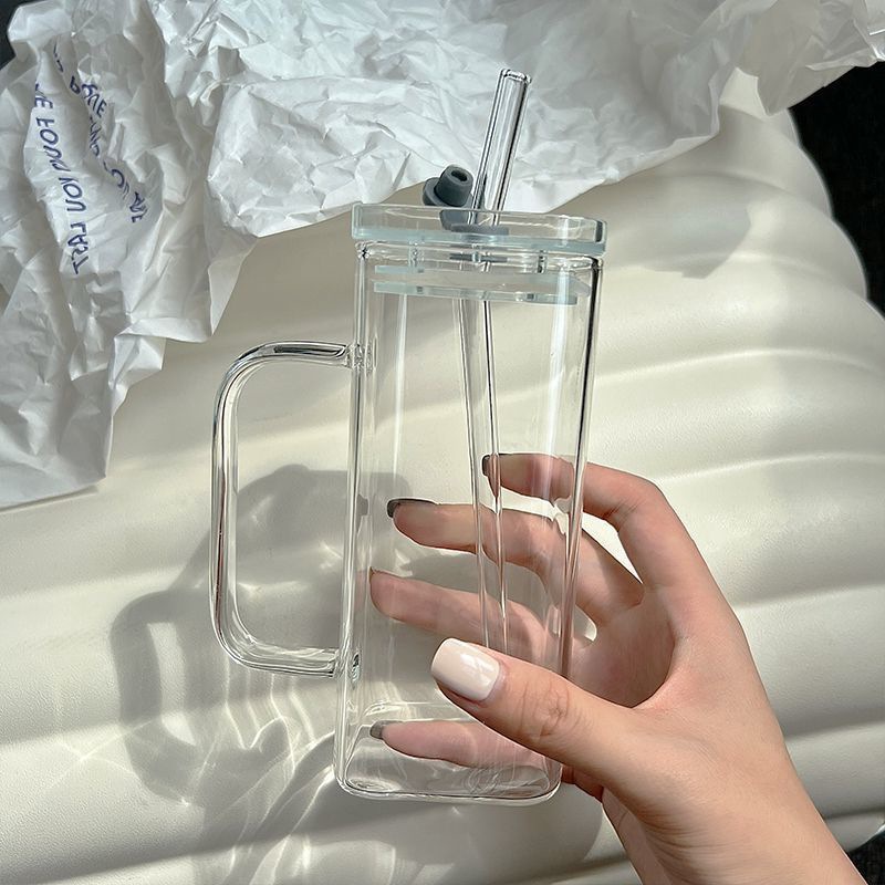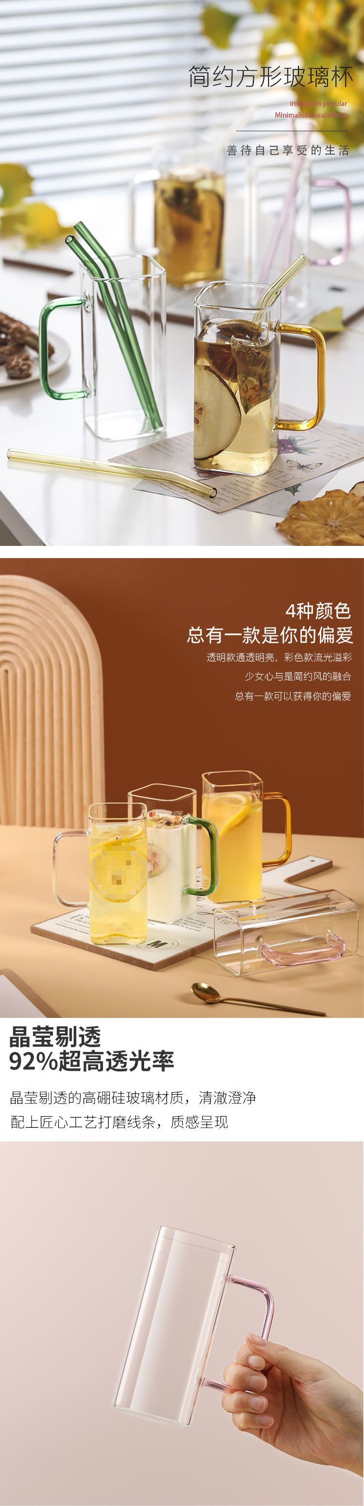 网红玻璃杯方形女士高颜值吸管水杯家用带把手透明简约平底可杯子
