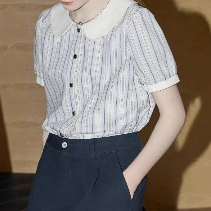 初恋风娃娃领条纹短袖棉衬衫女25年夏季新款甜美减龄衬衣