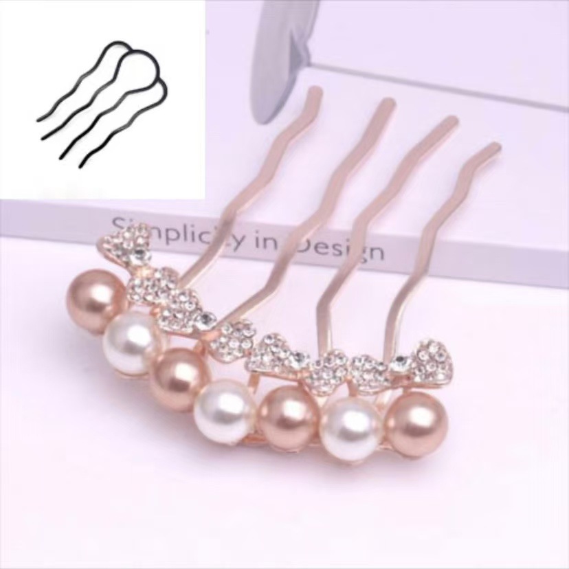韩版珍珠四齿插梳水钻盘头蝴蝶结发梳后脑勺成人发饰