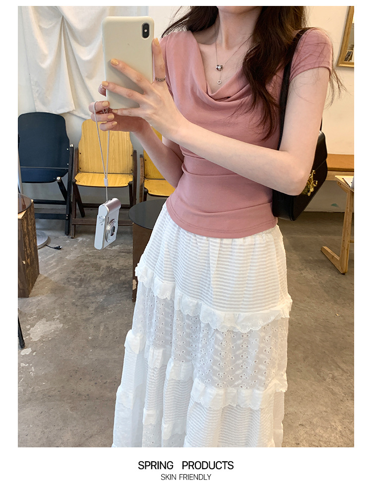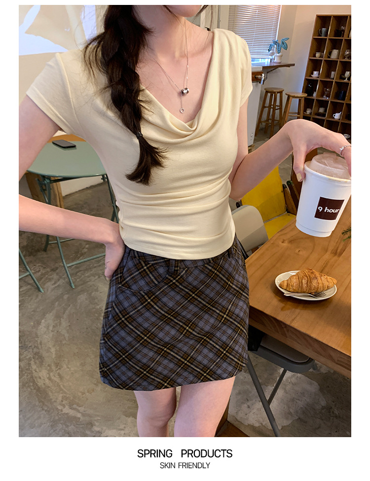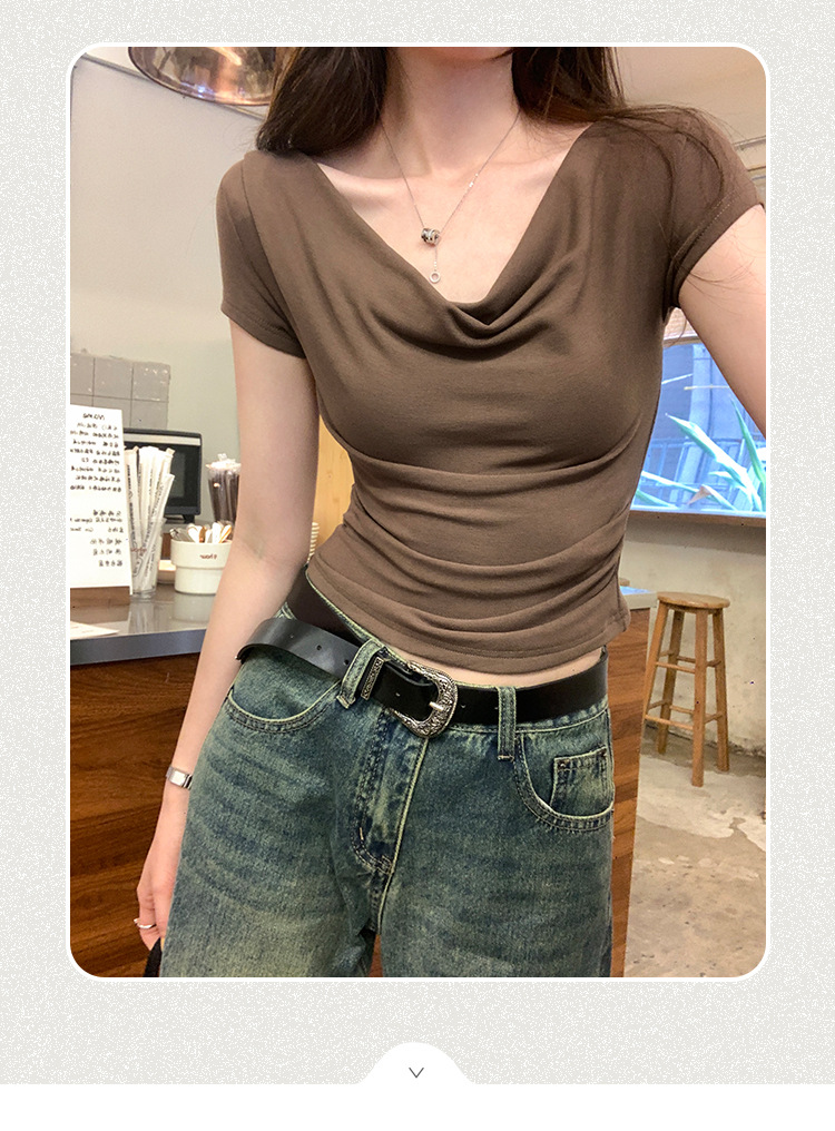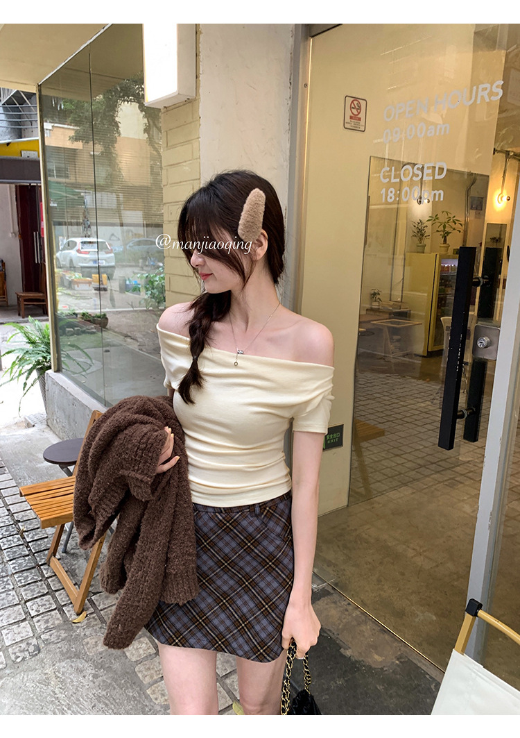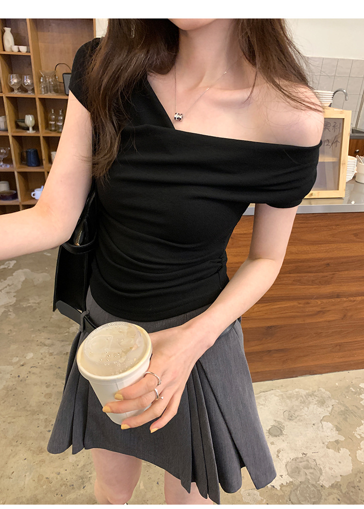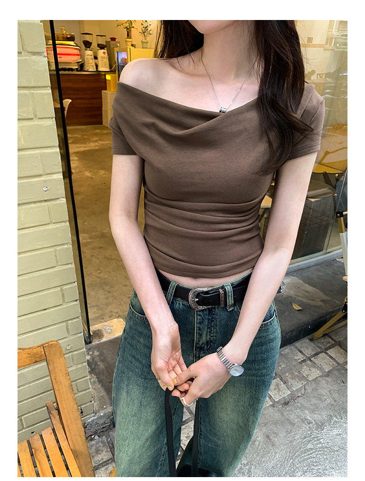 设计感荡领修身显瘦弹力短袖T恤女夏季新款一字斜肩短款上衣