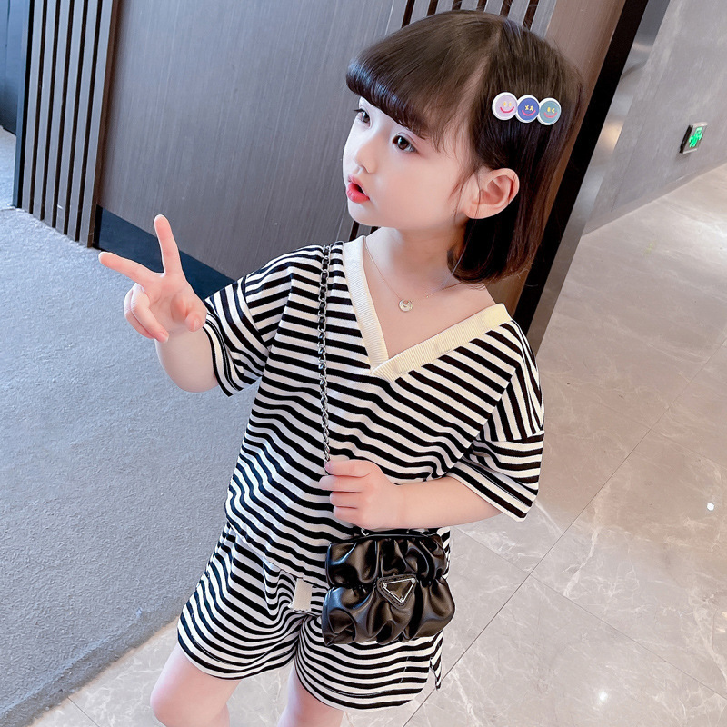 儿童条纹套装夏季新款女童蝴蝶结短袖T恤女宝短裤两件套1166