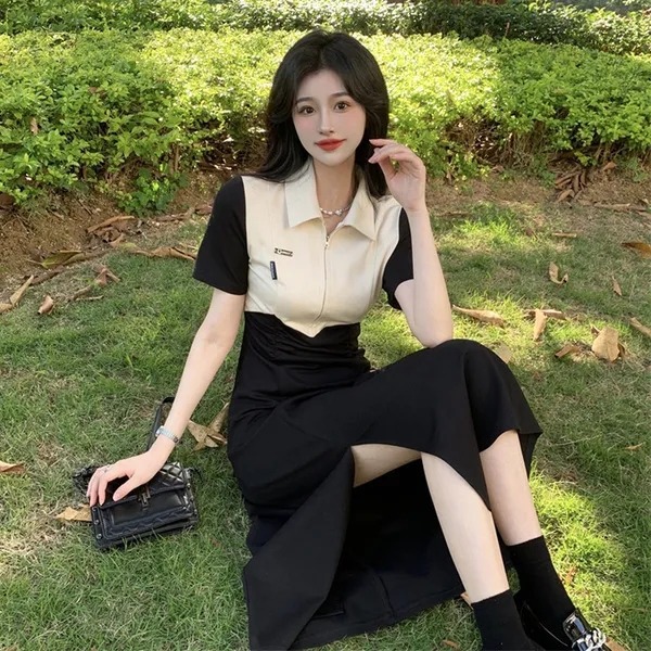 撞色设计感开叉连衣裙女春夏韩版新款POLO领收腰显瘦