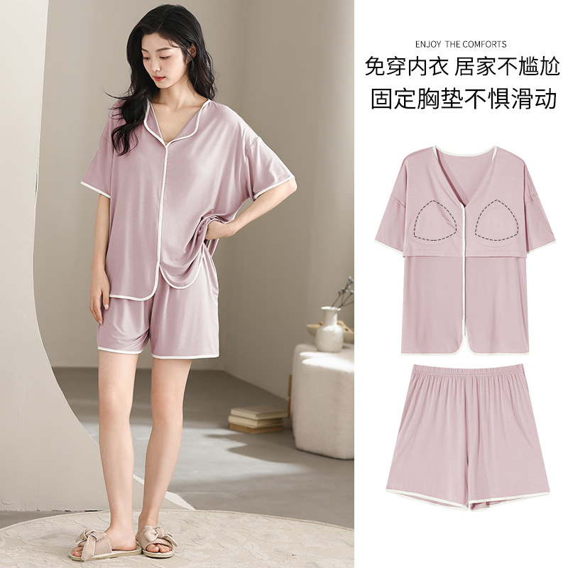 新款睡衣女士夏季莫代尔短袖休闲纯色带胸垫一体家居服夏天