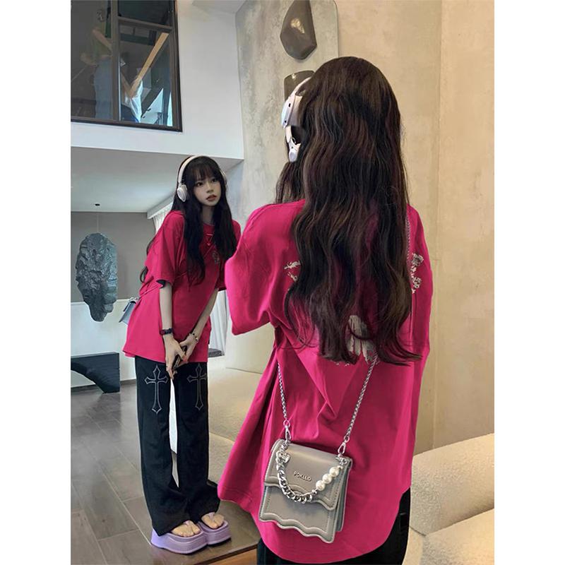 超好看短袖t恤多巴胺穿搭夏装新款女玫红色宽松重磅纯棉上衣