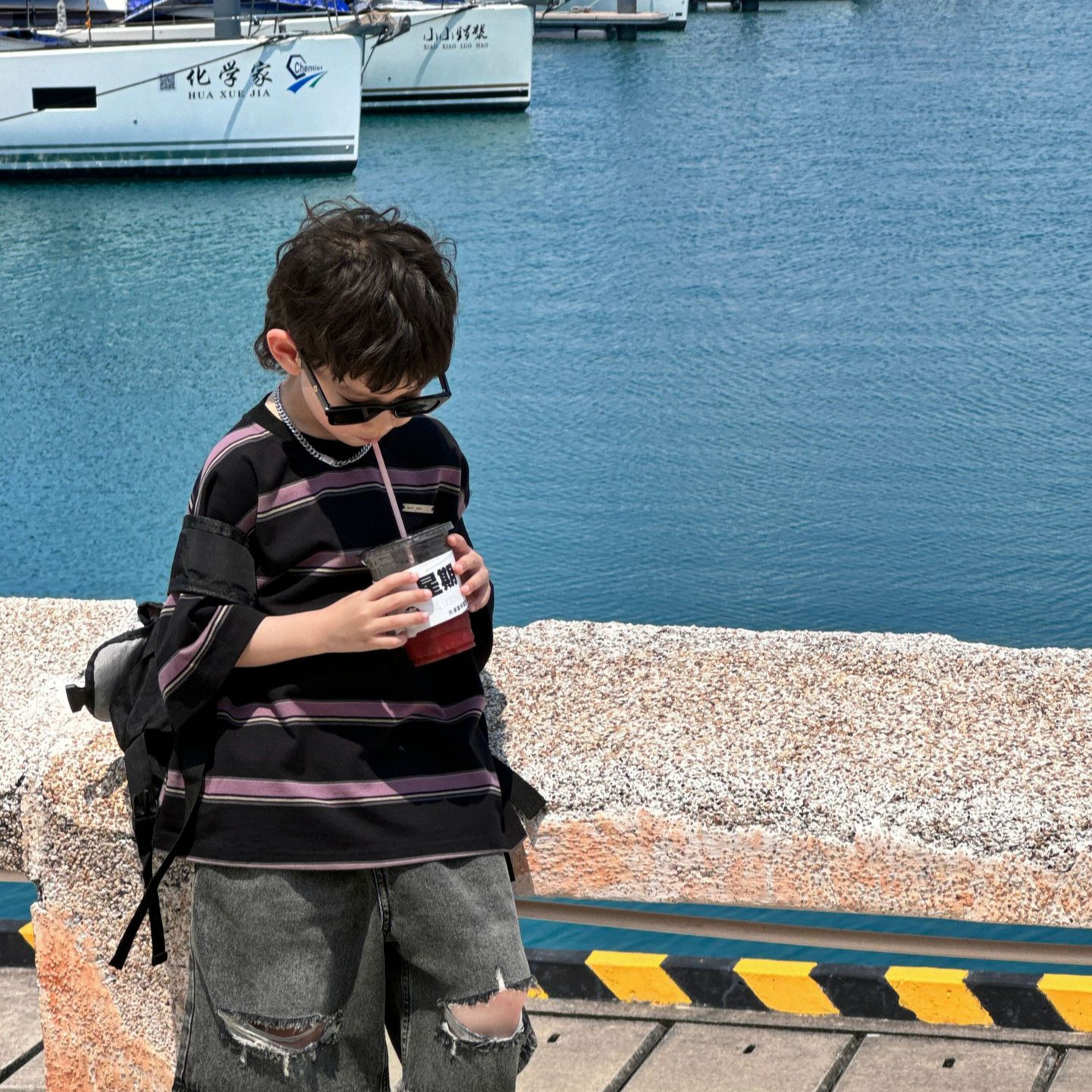 泰如夏季新款韩版男童条纹字母拼色设计感短袖T恤儿童上衣潮