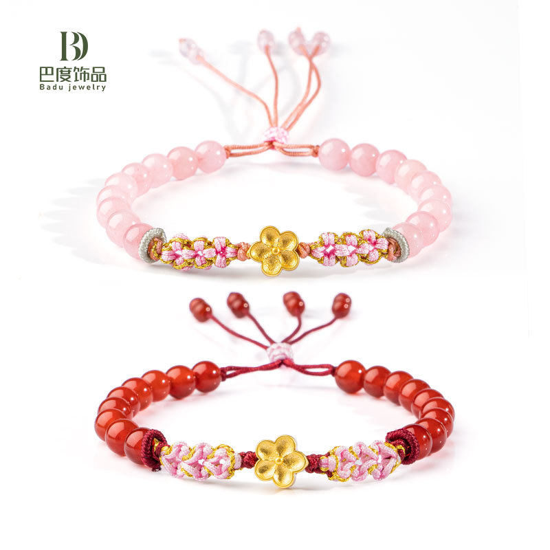冬季新品天然粉晶手工编织红绳手绳天然红玛瑙桃花手链女礼物