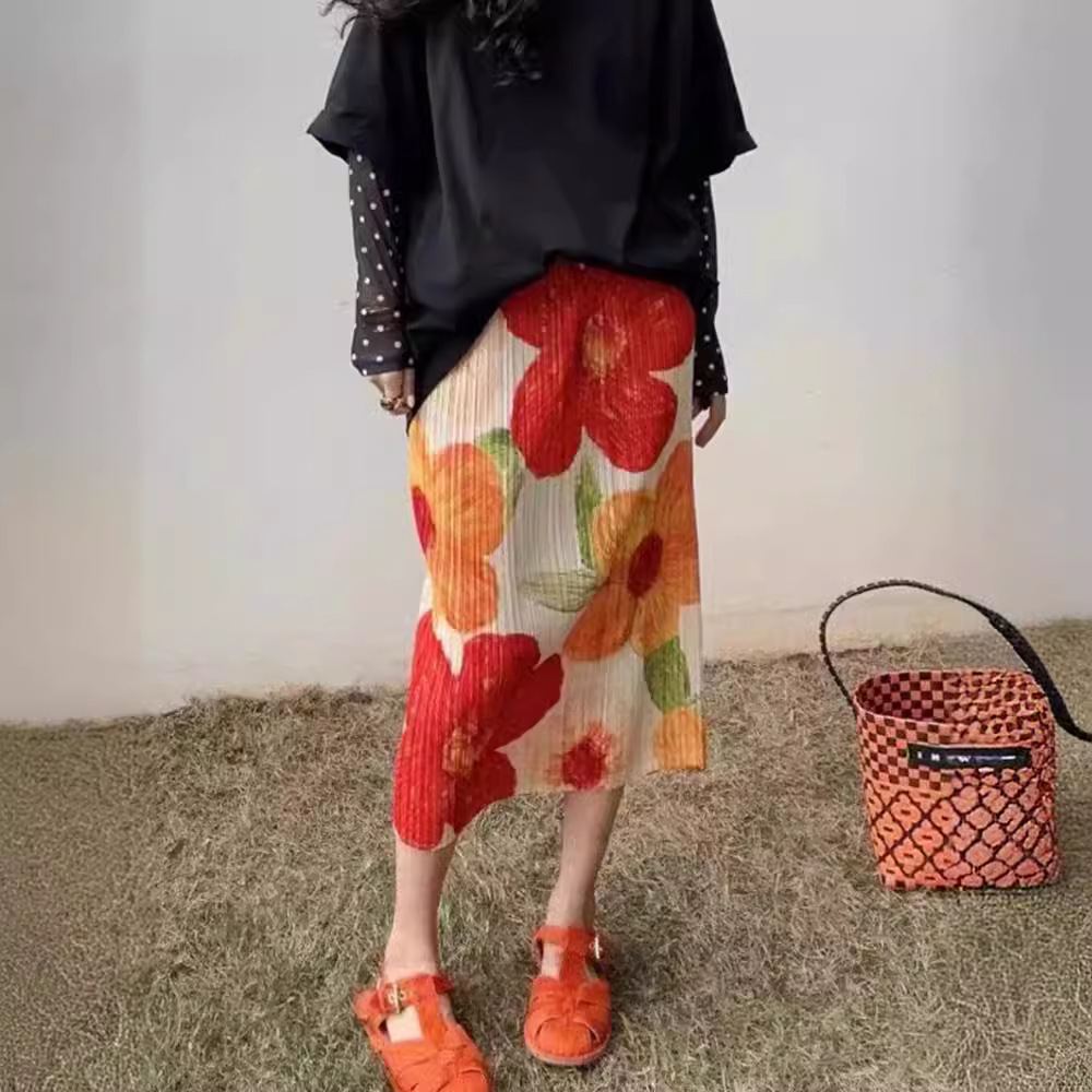 东南亚度假风小众设计感褶皱裙女夏高腰印花显瘦公主裙百褶裙子