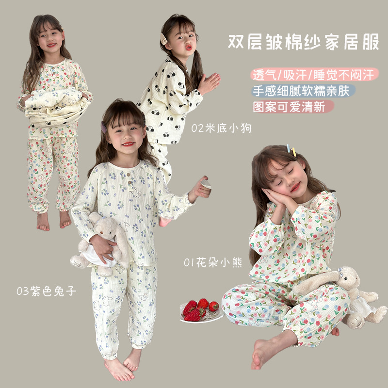 艾摩贝贝女童韩版碎花居家空调服儿童春夏卡通棉纱家居服套装