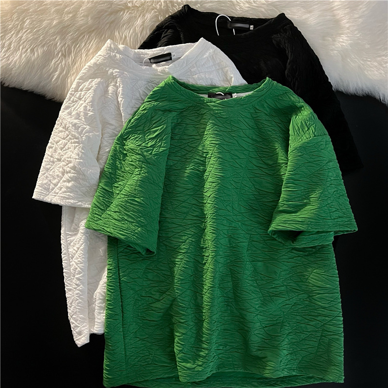 欧美个性高级感肌理纹中长款短袖T恤夏季正肩五分袖情侣上衣