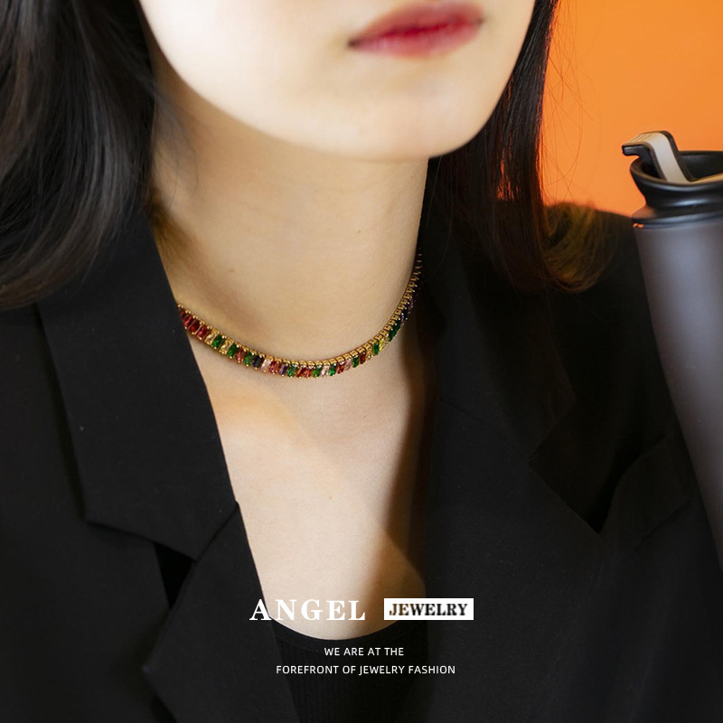 高级感七彩方形时尚小众设计复古闪钻锆石项链气质个性项链女