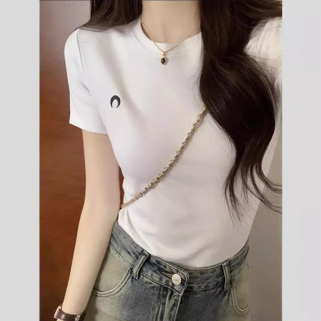 白色圆领正肩短袖t恤女夏季新款纯欲风刺绣修身显瘦辣妹内搭上衣