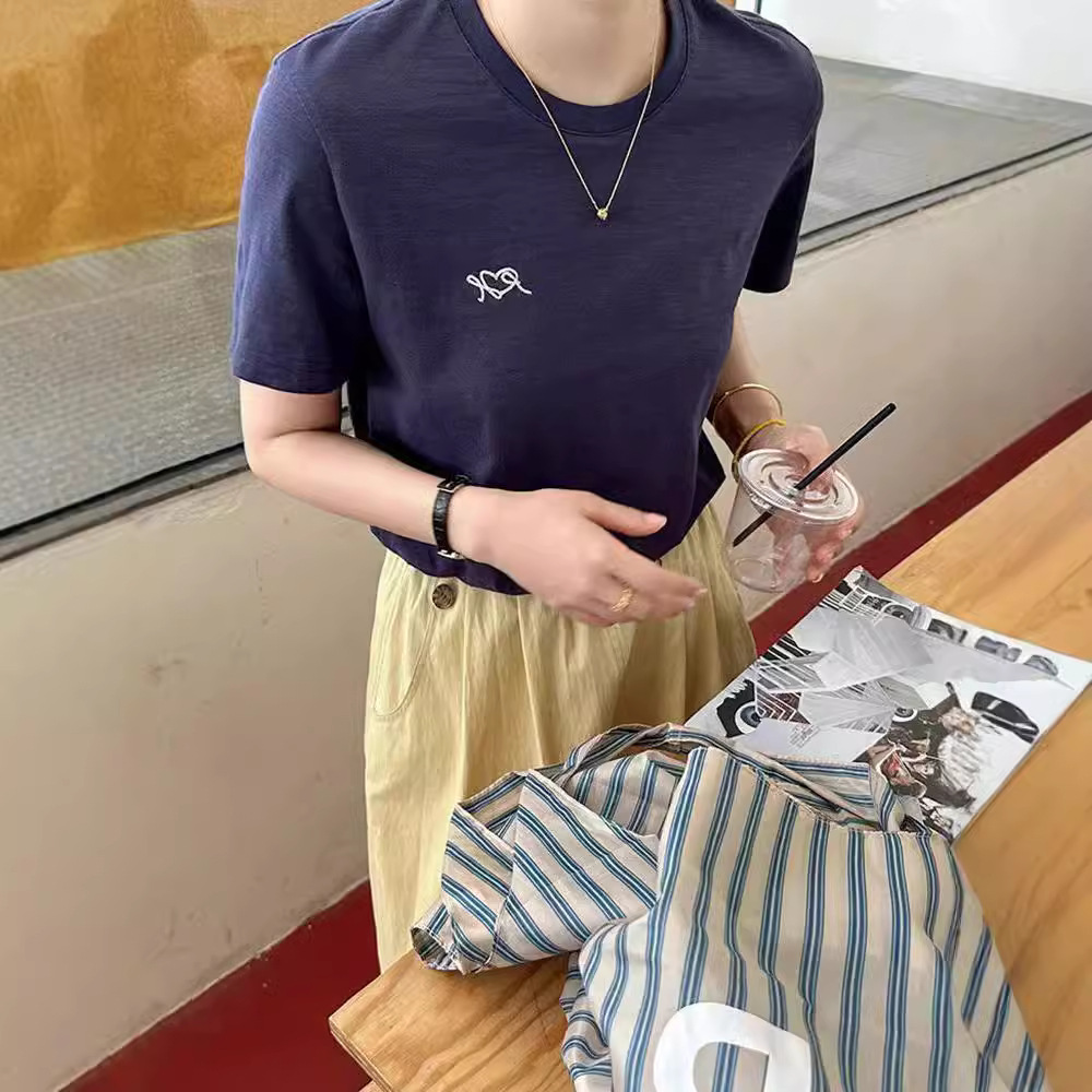 夏季清凉透气竹节棉T恤简约减龄百搭精美刺绣宽松显瘦短袖女上衣