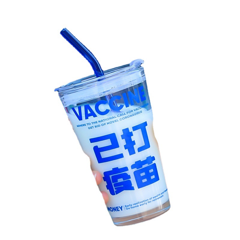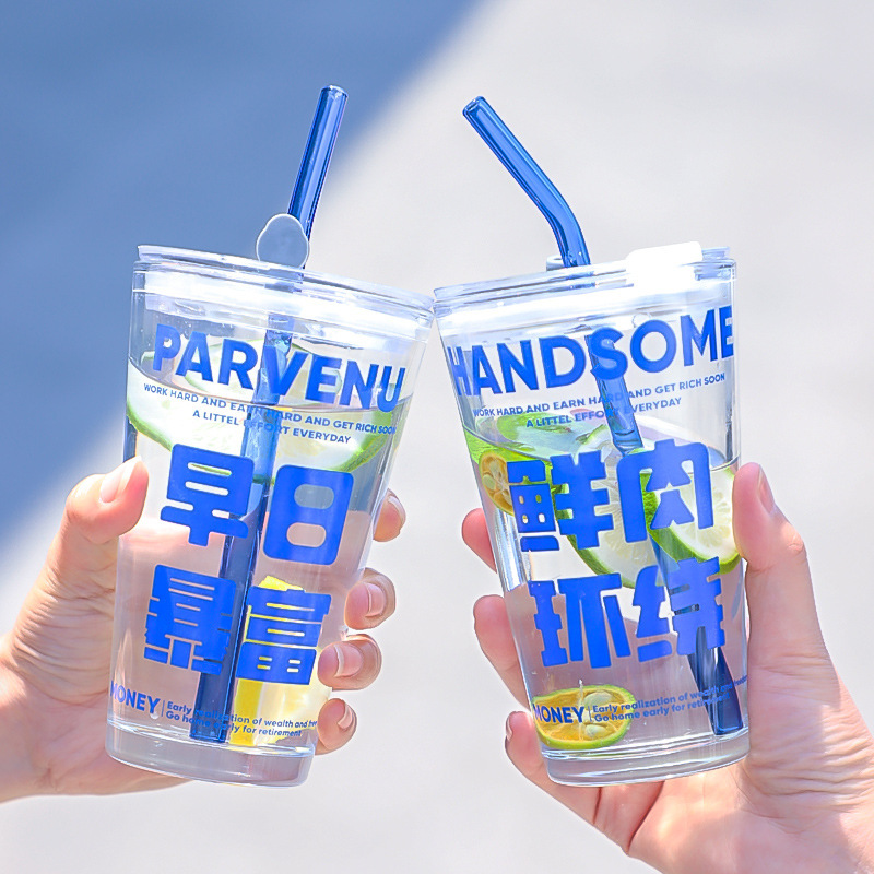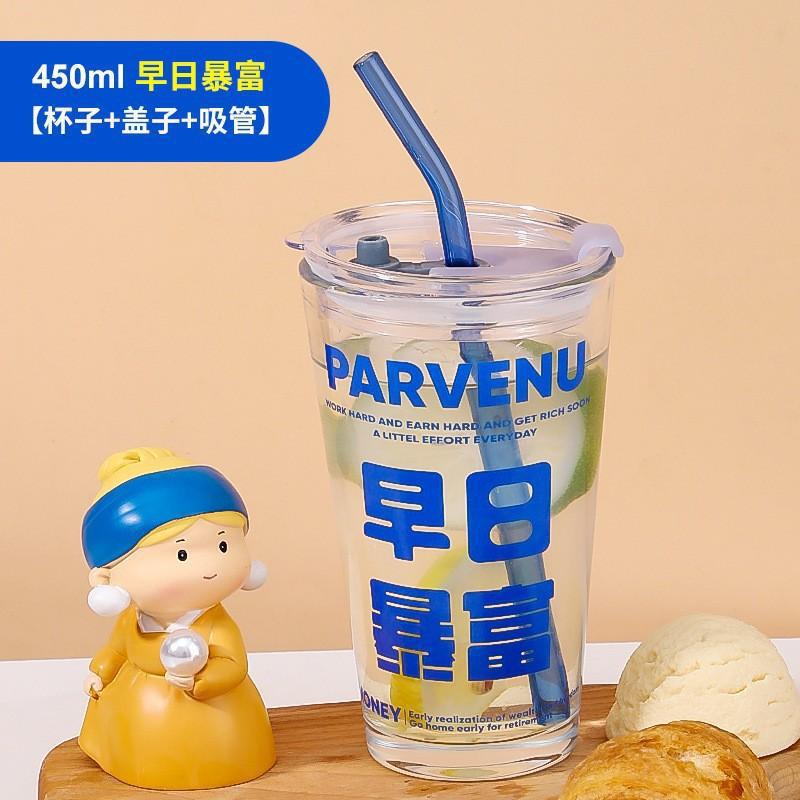 创意网红带吸管水杯 办公室带盖把手玻璃水杯 伴手礼卡通杯单件套