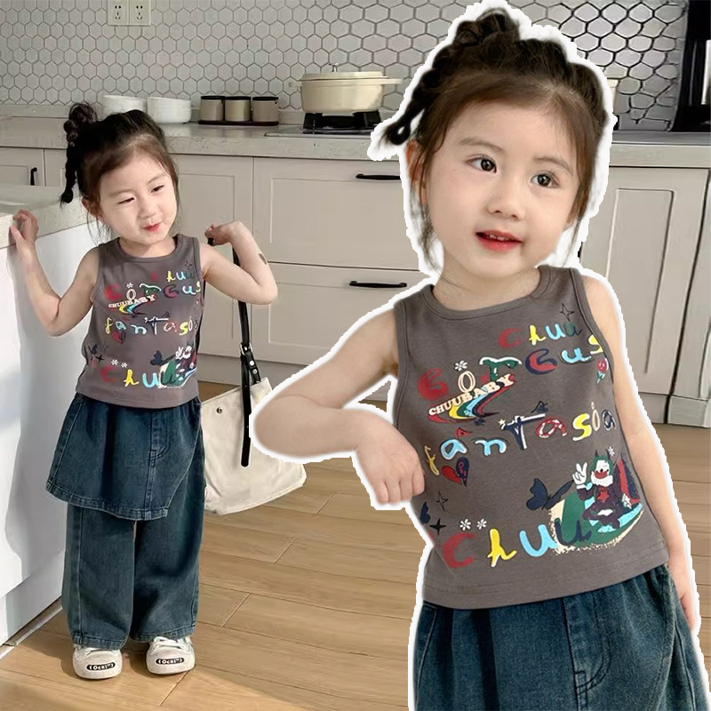 夏美式复古字母涂鸦小背心女童潮流个性短款修身百搭无袖T恤
