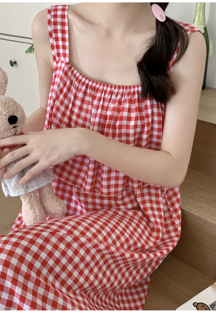 春夏季新款甜美可爱纯棉睡衣两件套红蓝撞色格纹休闲家居服可外穿