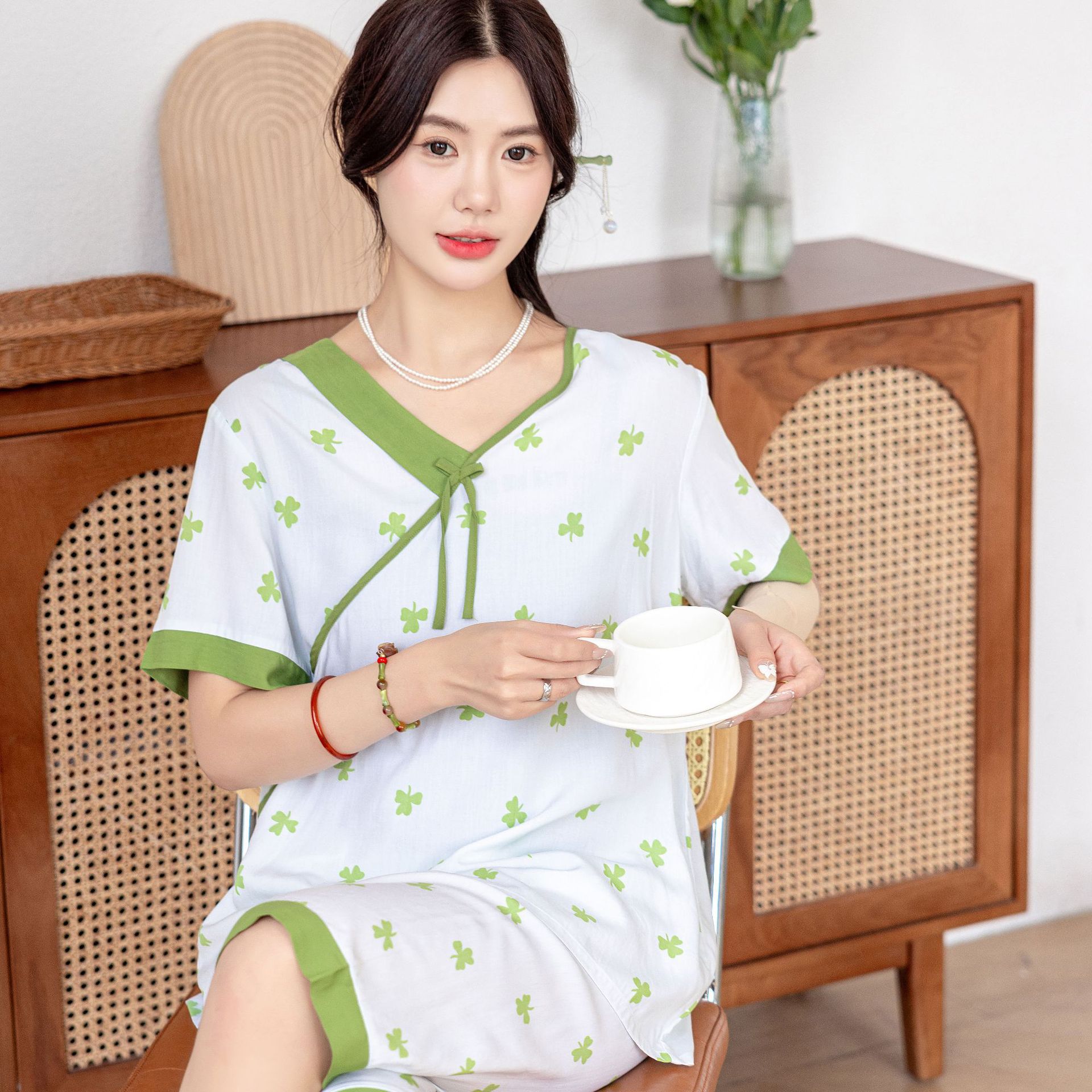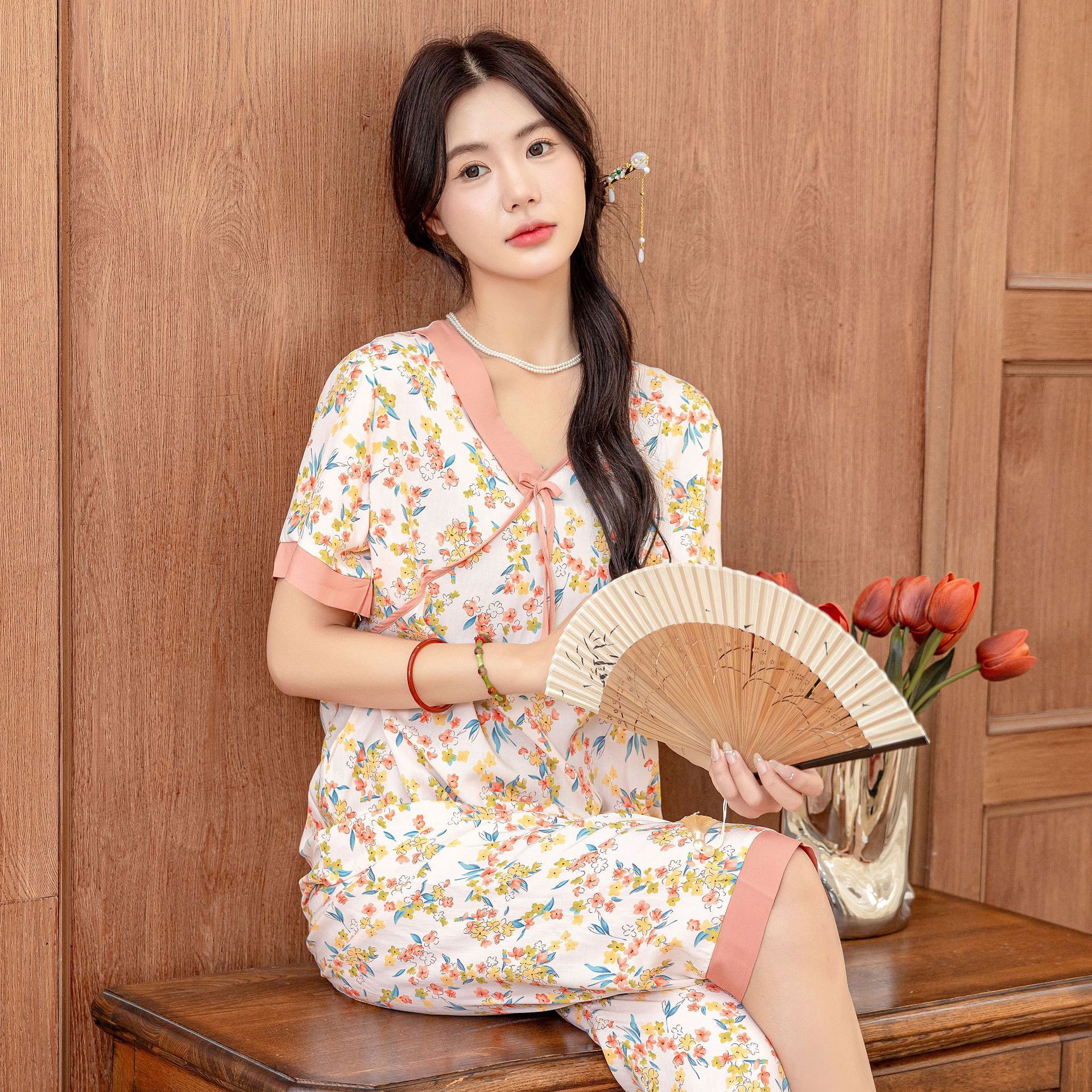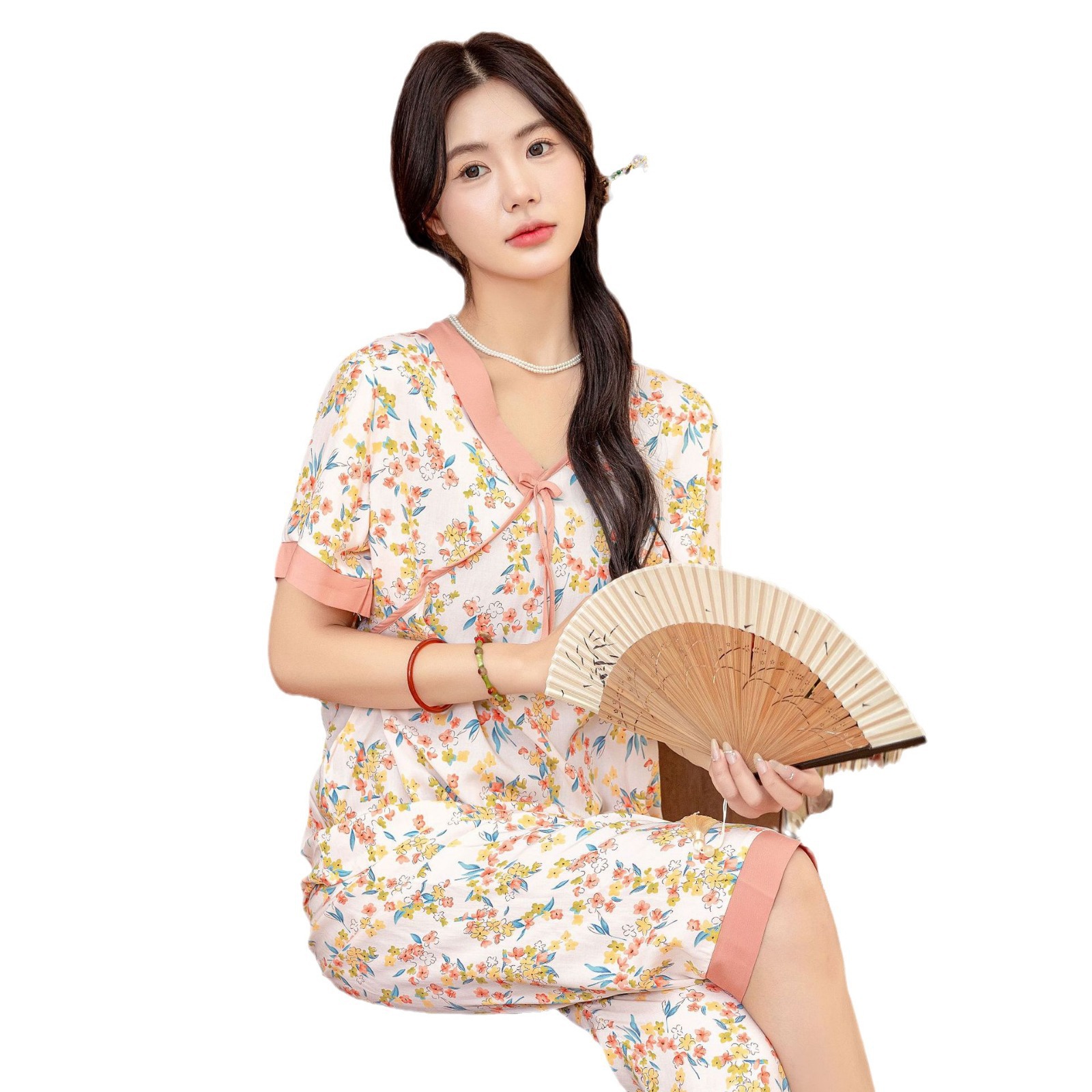 棉绸睡衣短袖女士夏季新款V领国风中式人棉套装薄款人造棉家居服