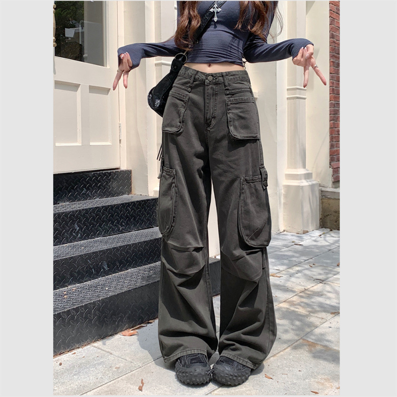安克拉红美式甜酷辣妹阔腿牛仔裤女宽松休闲多口袋工装裤女