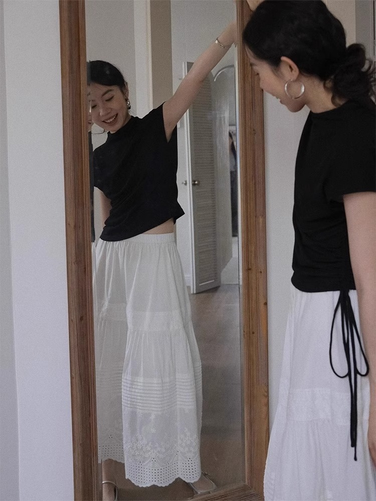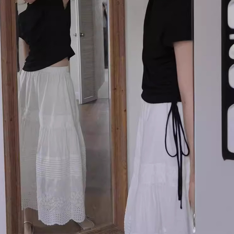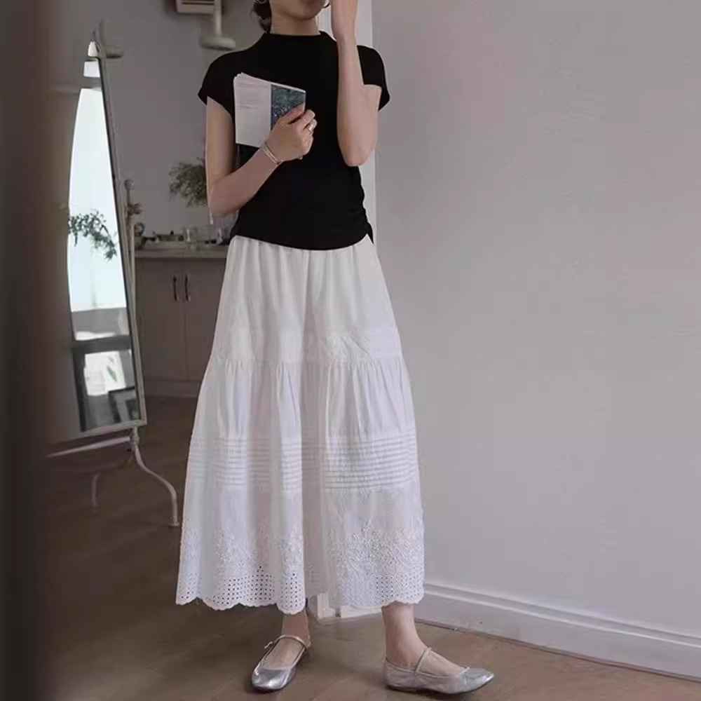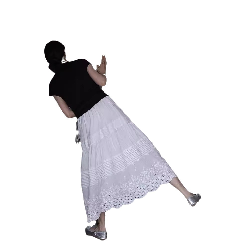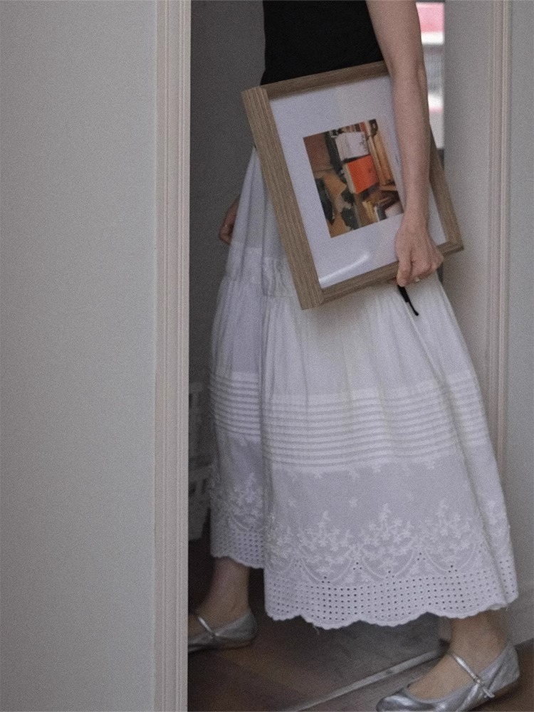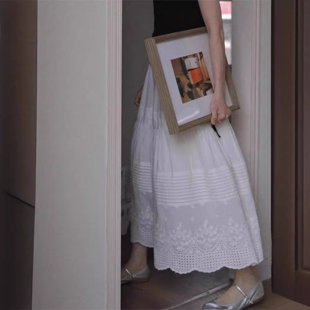 法式高级感白色蕾丝高腰半身裙女春夏薄款垂感棉麻中长款a字伞裙