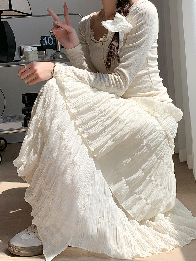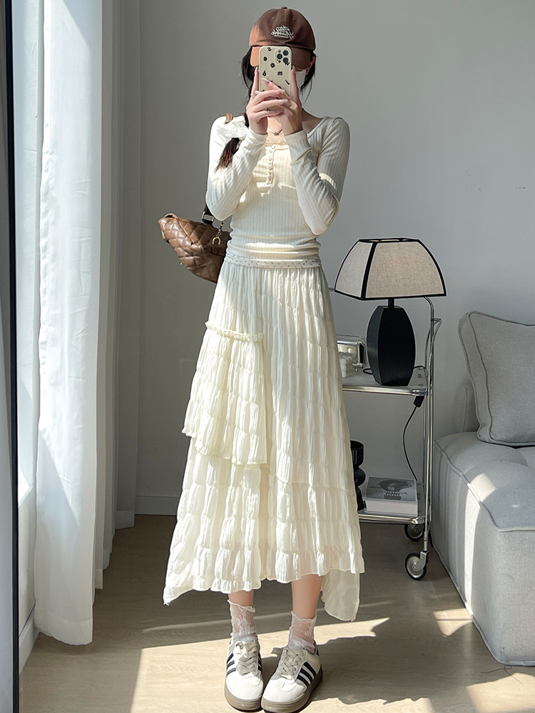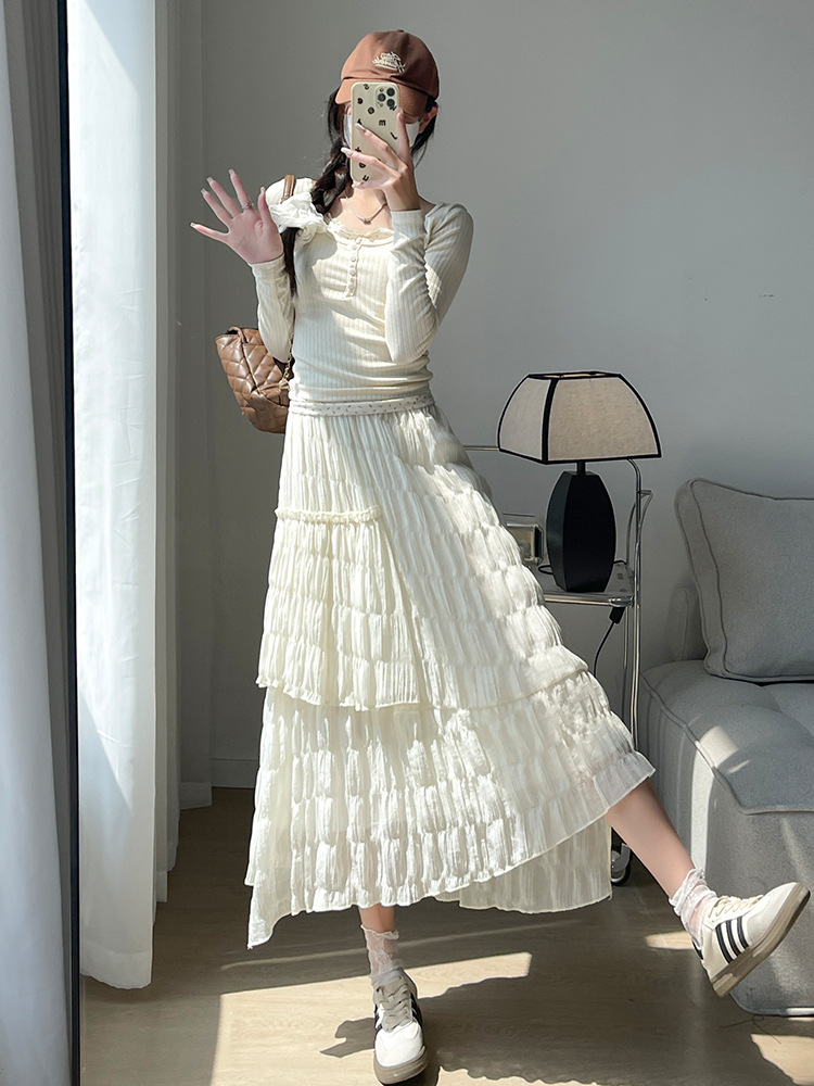 白色半身裙女春秋季高腰显瘦温柔风a字裙中长款蕾丝蓬蓬蛋糕裙子