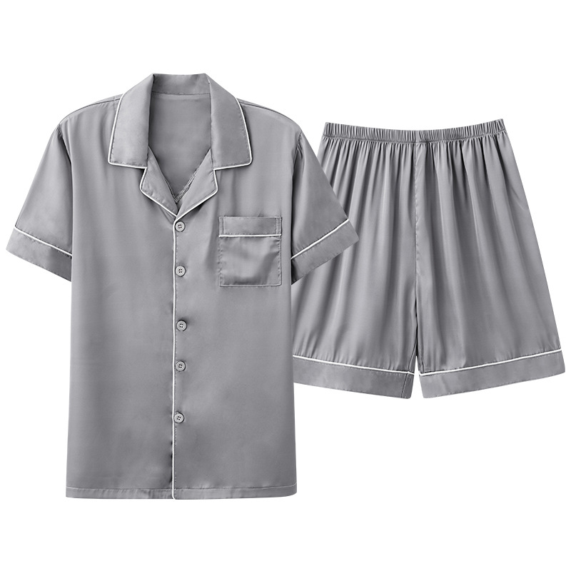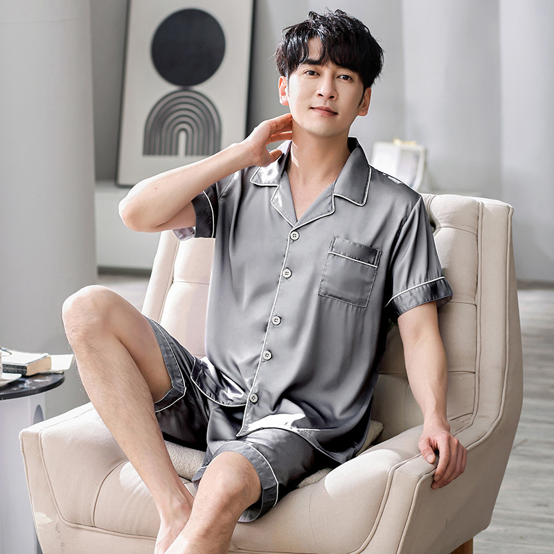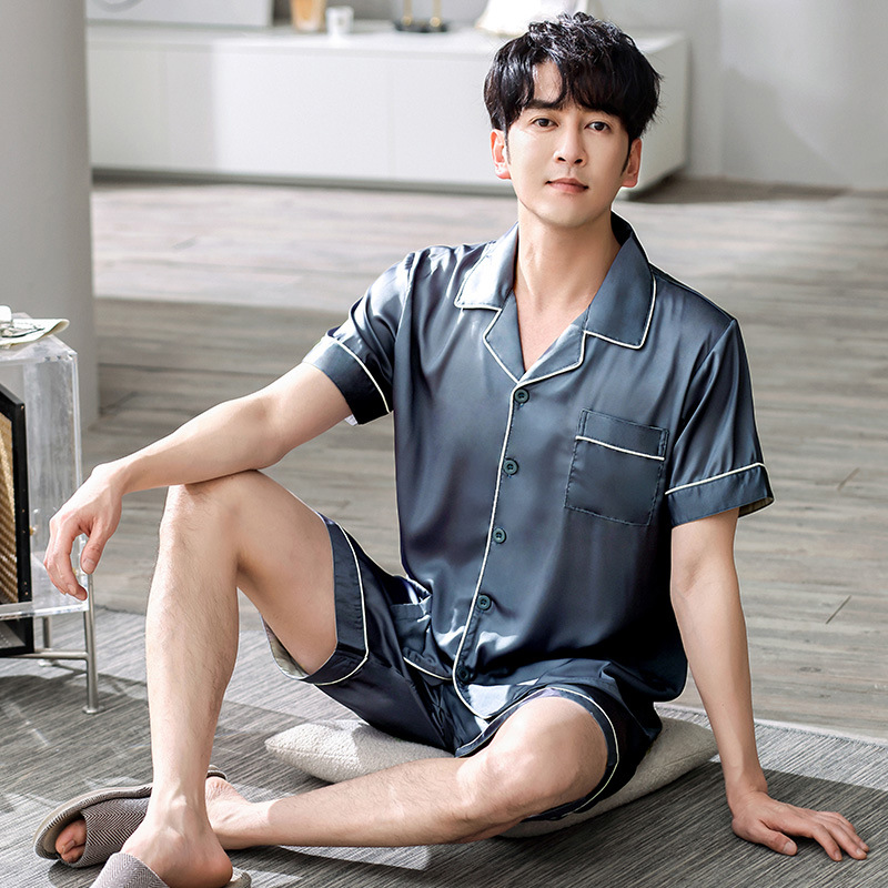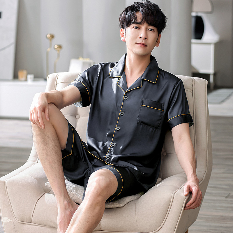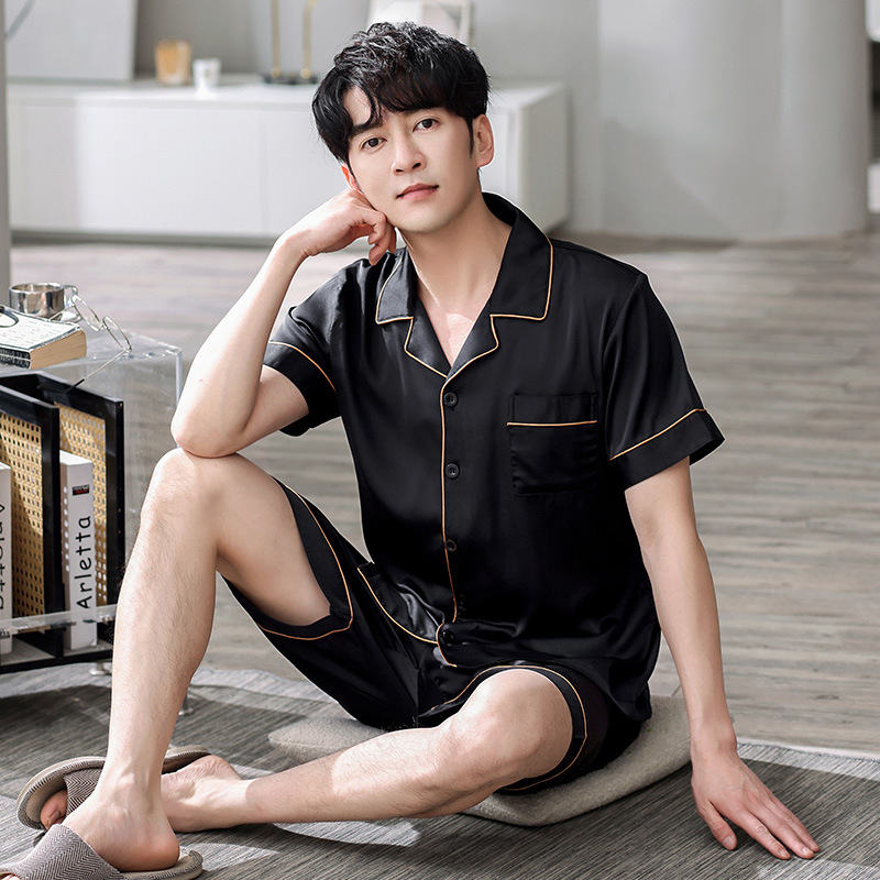 春夏短袖长裤真丝睡衣男士开衫纯色花边两件套装高级感家居服