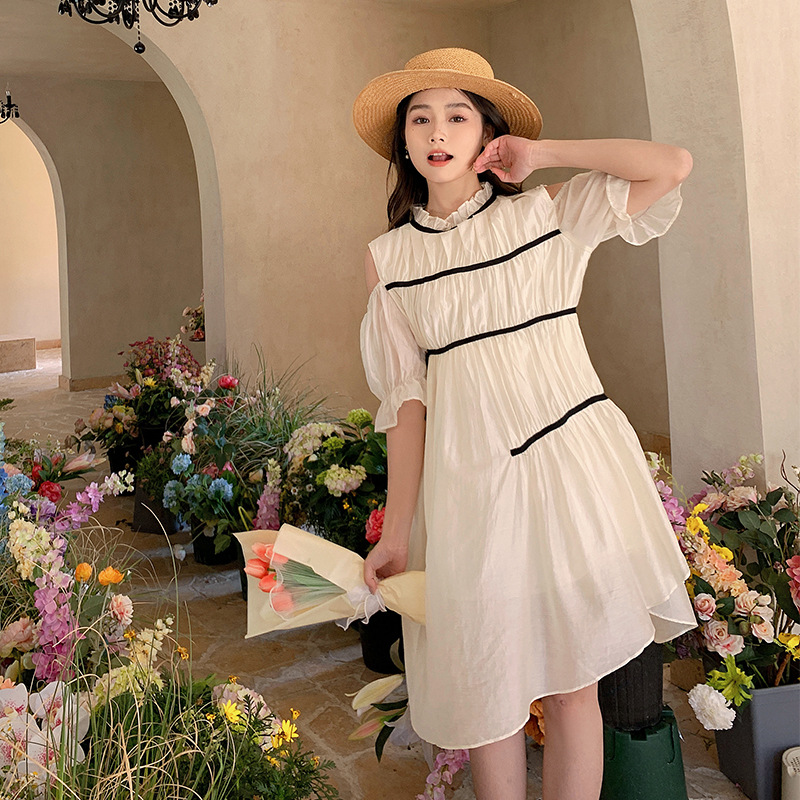 夏不对称飘带连衣裙夏法式新款收腰显瘦小众海边度假沙滩裙