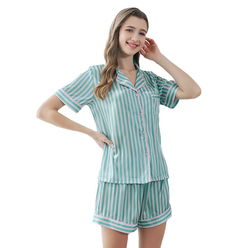 秘密同款绿色条纹提花睡衣女短袖短裤真丝套装家居服