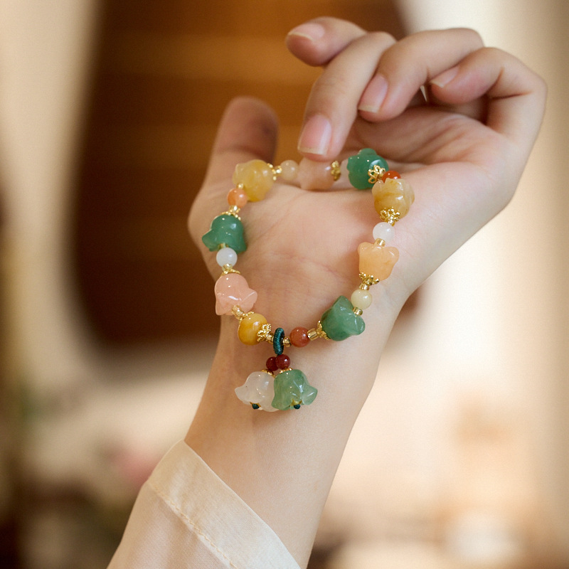 新疆天然金丝玉手链女铃兰花彩色花朵玉石手链时尚送闺蜜礼物