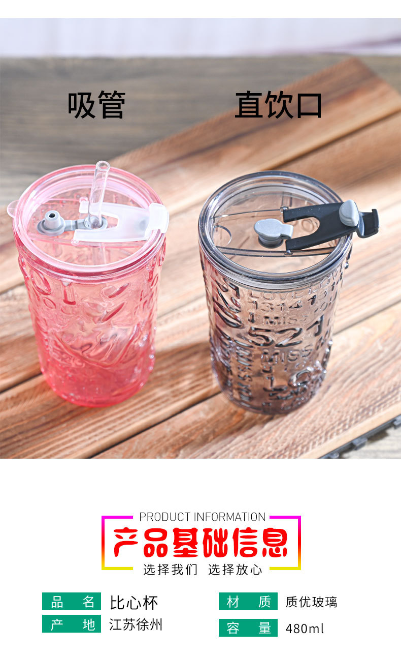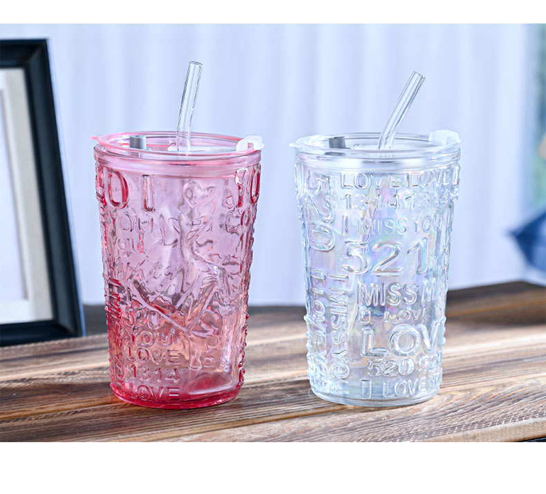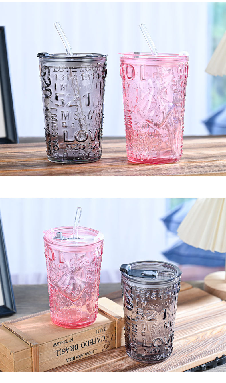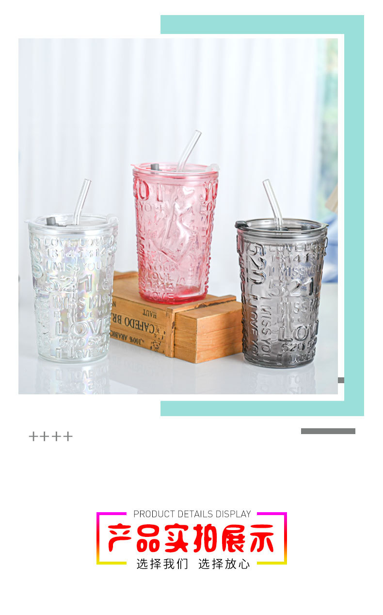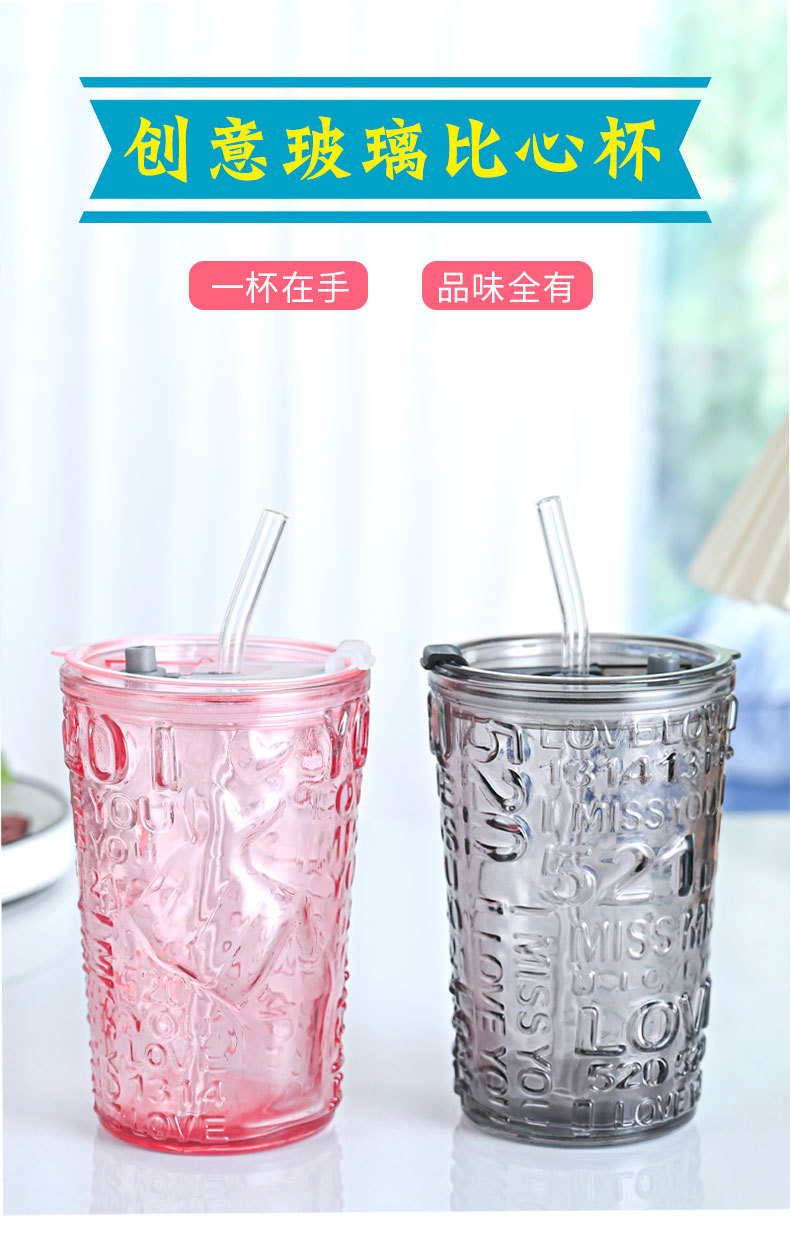 比心高颜值情侣水杯玻璃浮雕吸管杯网红比心杯带盖新款咖啡奶茶杯