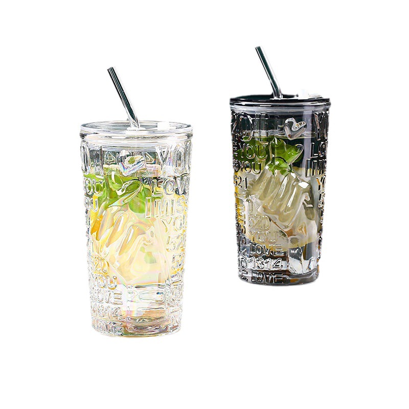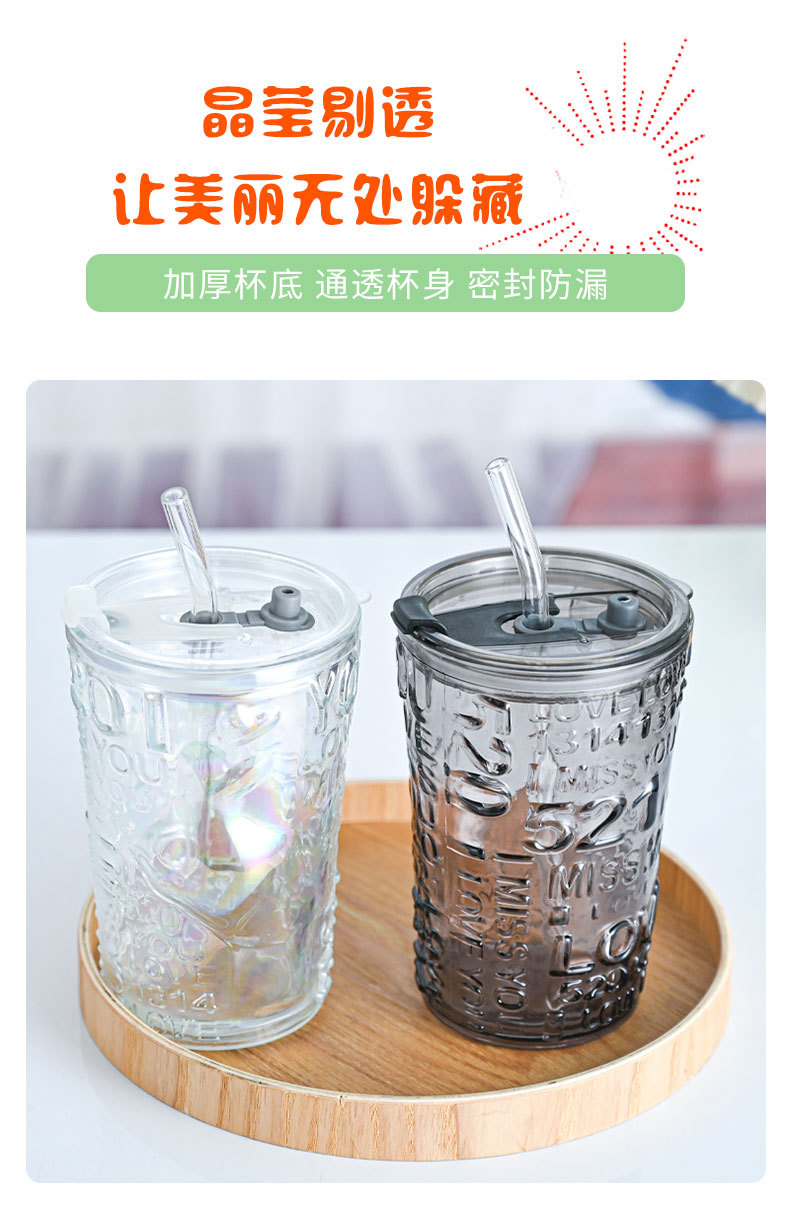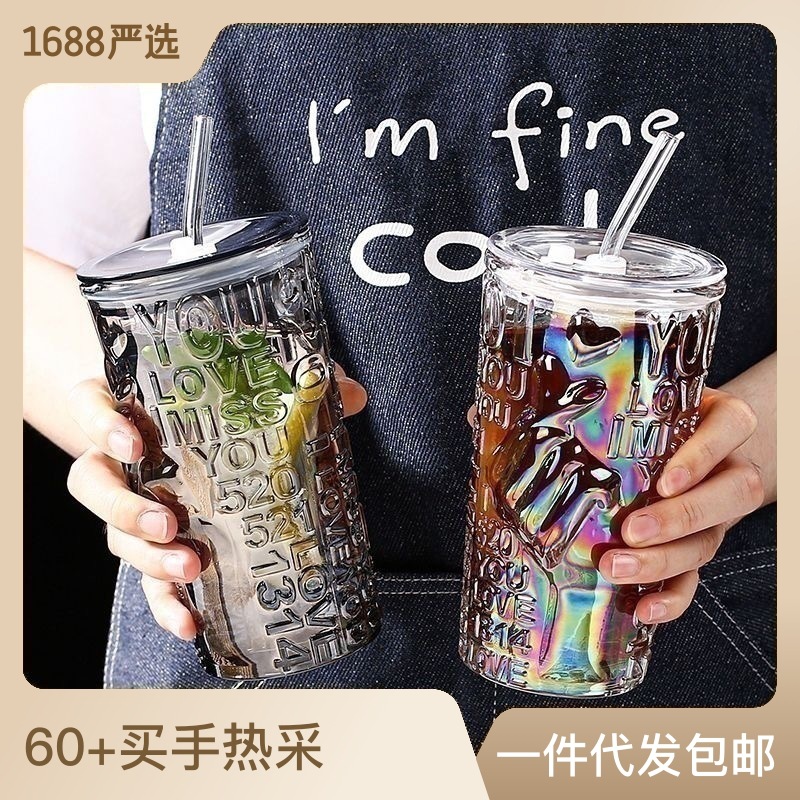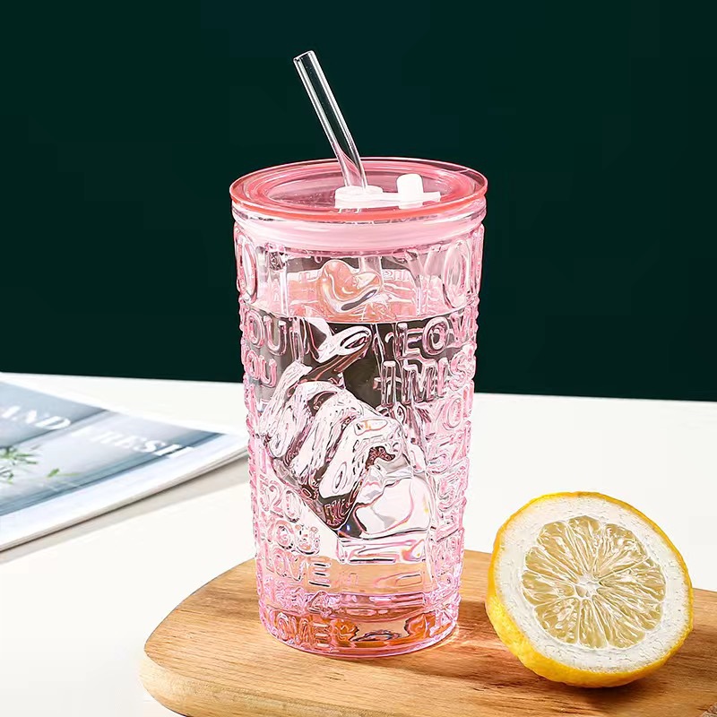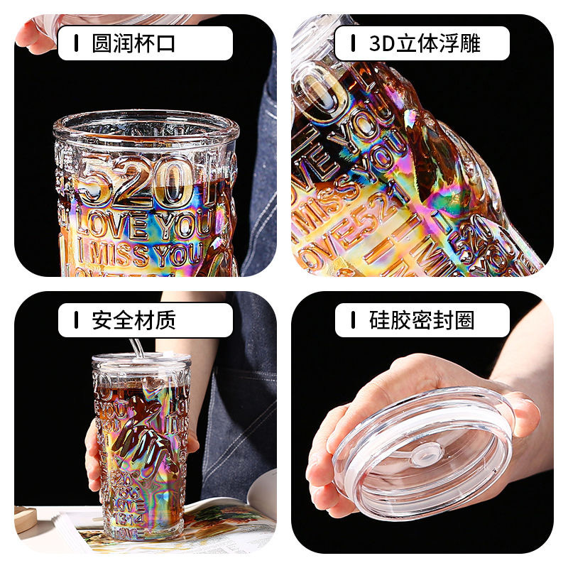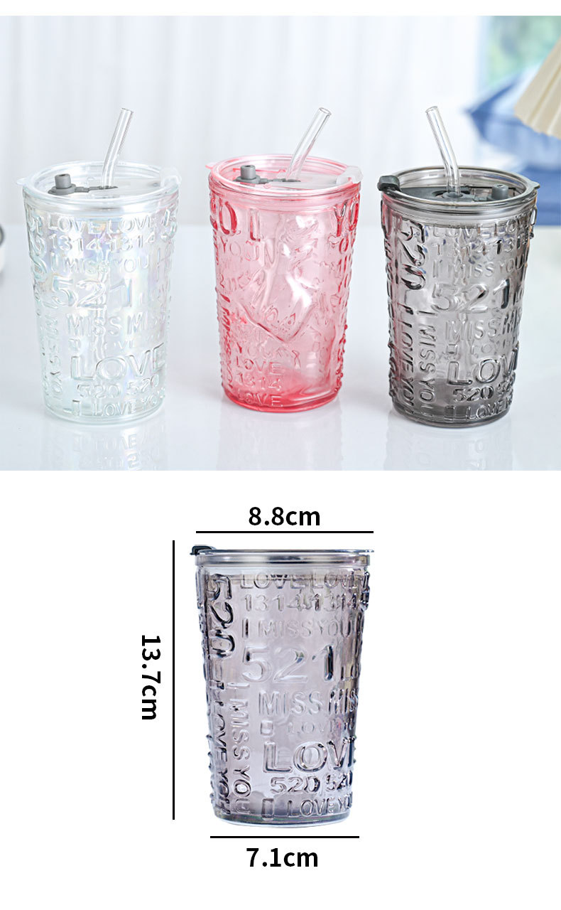 比心高颜值情侣水杯玻璃浮雕吸管杯网红比心杯带盖新款咖啡奶茶杯