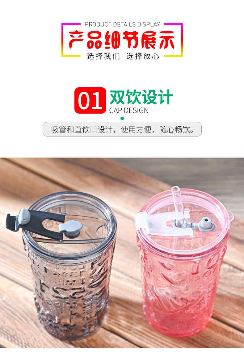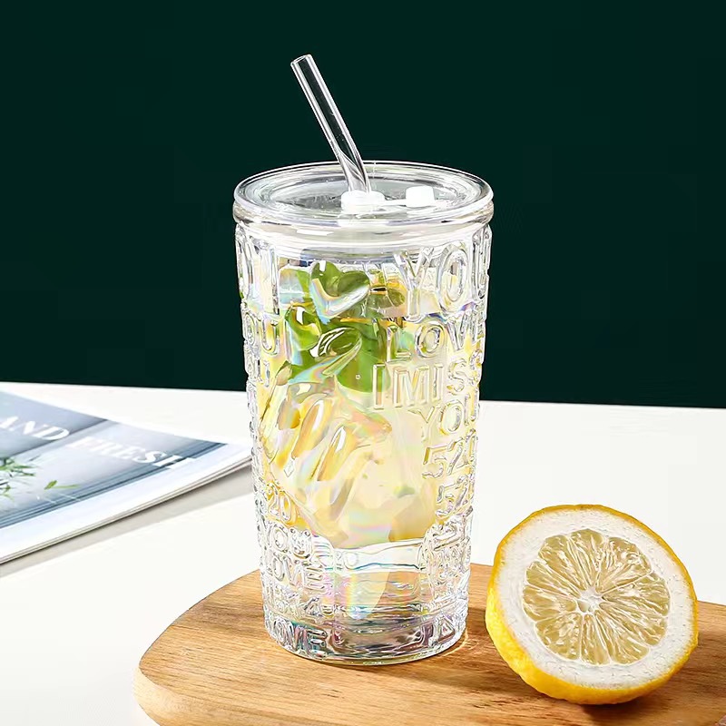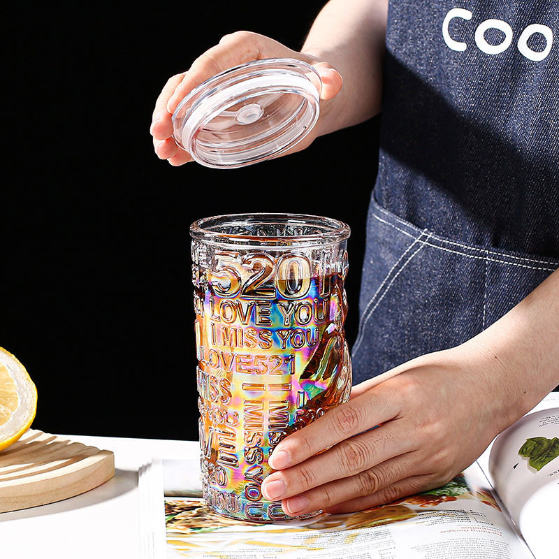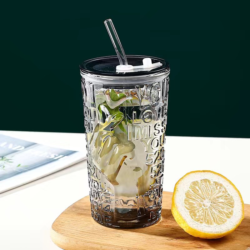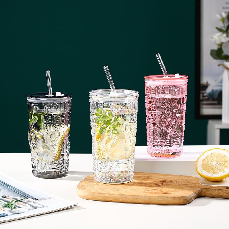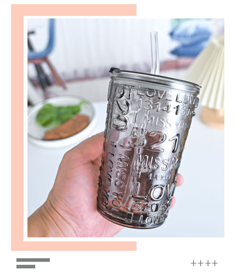 比心高颜值情侣水杯玻璃浮雕吸管杯网红比心杯带盖新款咖啡奶茶杯