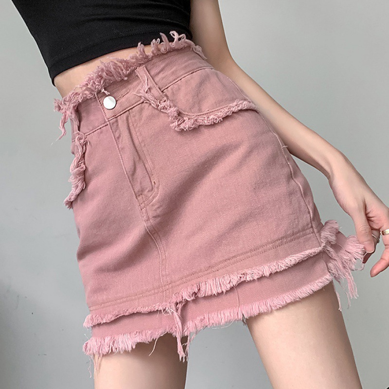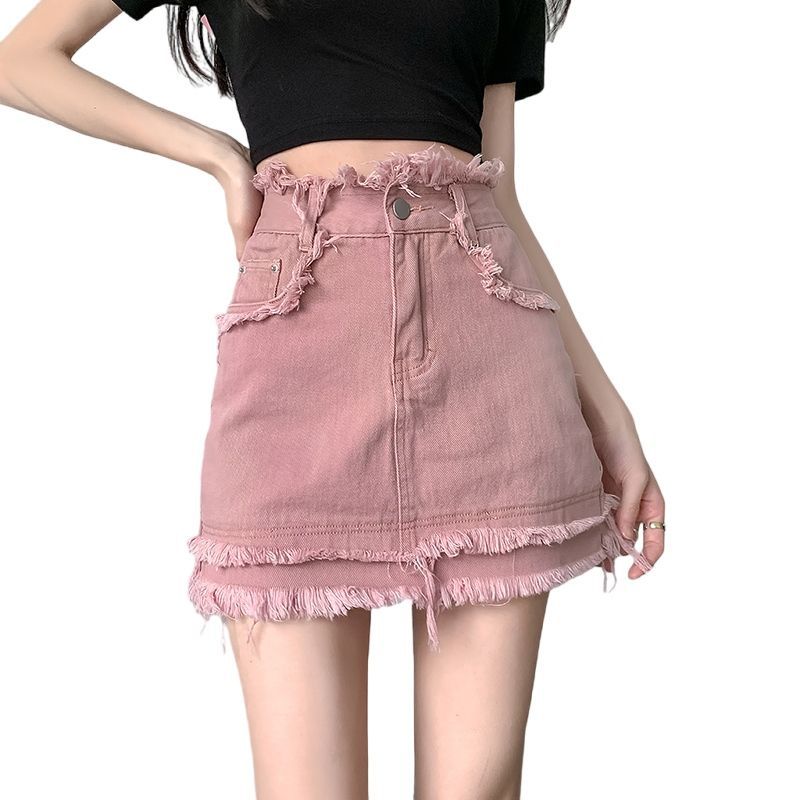 辣妹韩版樱粉半身裙女装夏季高腰毛边包臀a字裙防走光潮