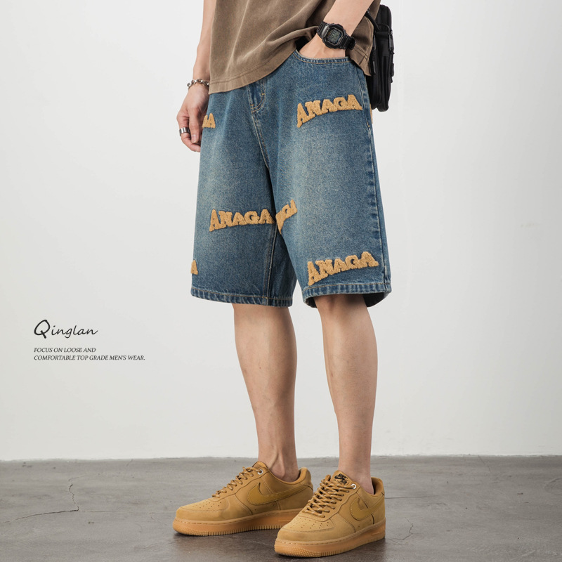夏季薄款潮牌水洗牛仔短裤男刺绣宽松直筒中裤美式嘻哈休闲五分裤