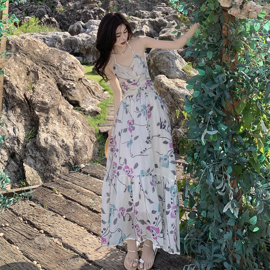 法式吊带碎花沙滩度假连衣裙新款女温柔风修身长款裙子