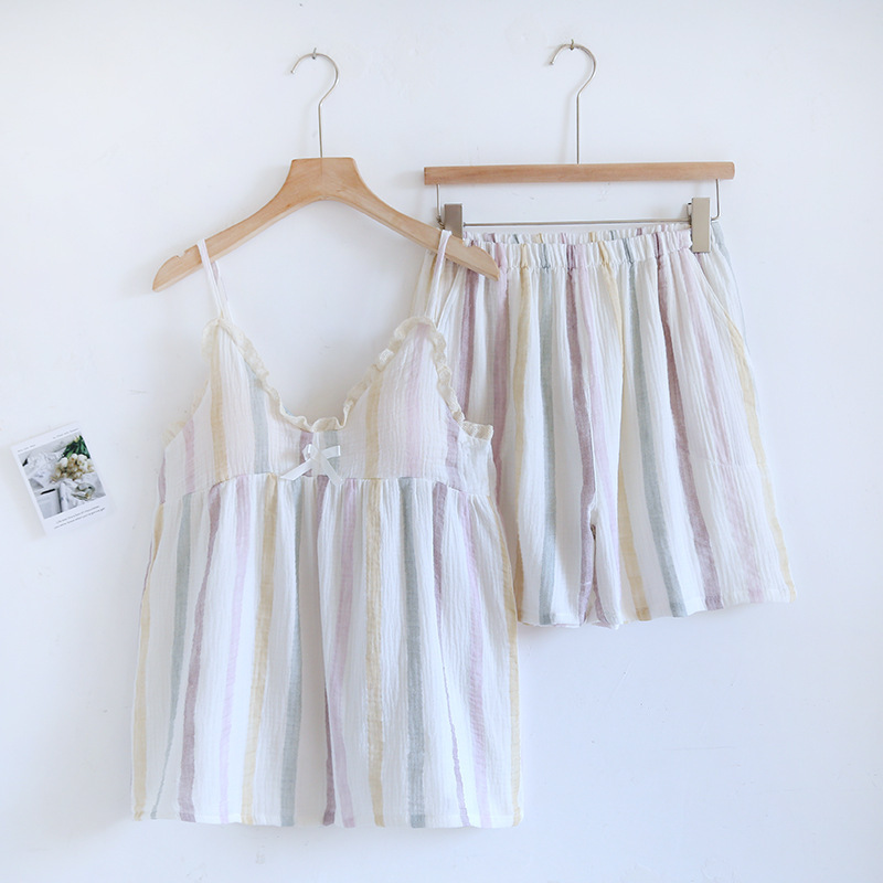 纯棉睡衣女夏季绉布吊带胸垫两件套装甜美可爱清新家居服可外穿