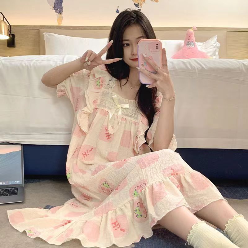 带胸垫睡裙女夏季棉纱短袖宽松甜美可爱公主睡衣女士春秋款家居服